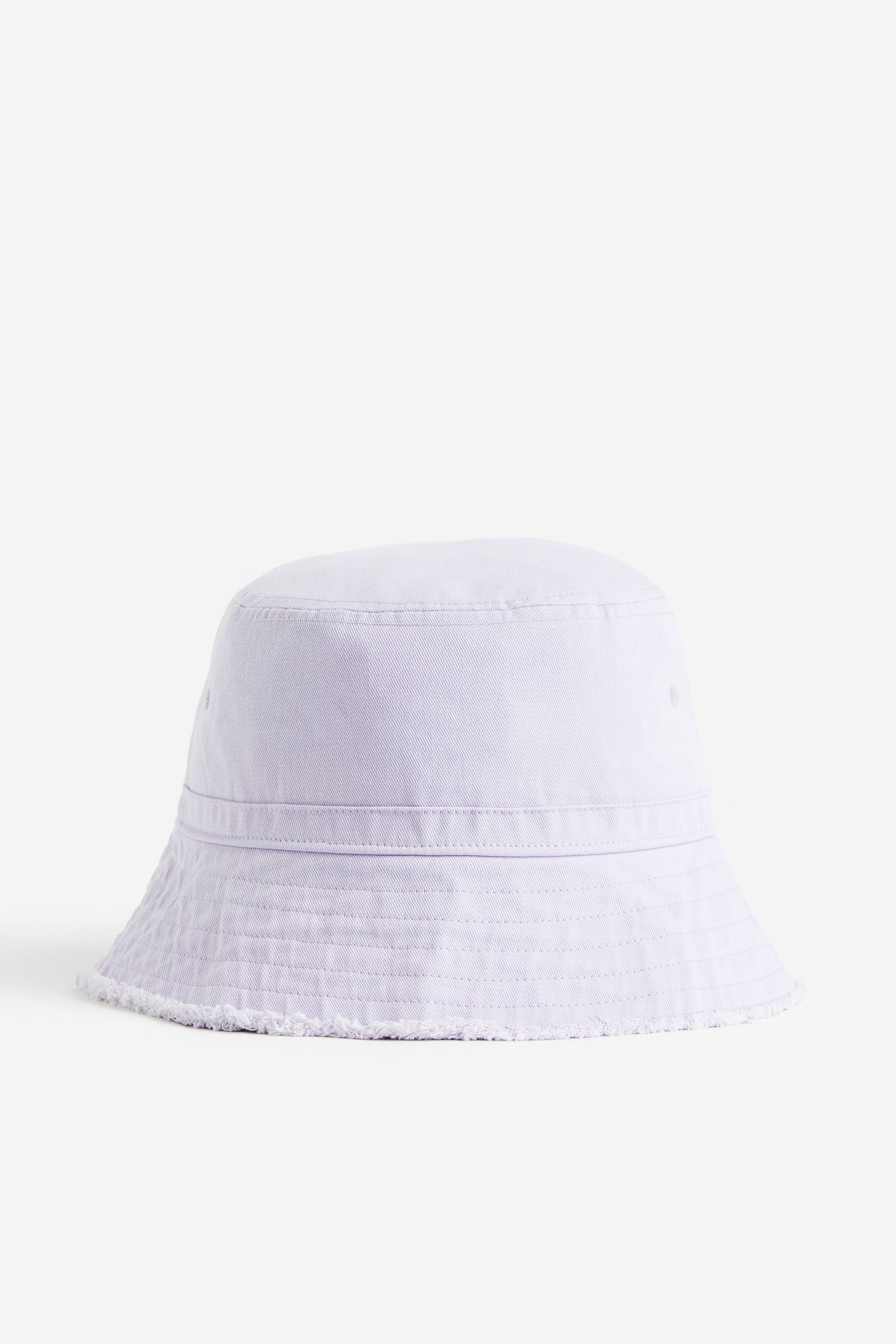 Bucket hat in cotton twill with embroidered eyelets and a wide, sloping brim with raw edges.
