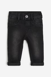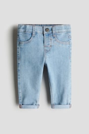 Jeans in washed denim with a slim fit through the hip, thigh and leg. Adjustable, elasticated waist, a fake fly with a press-stud, fake front pockets and real back pockets.