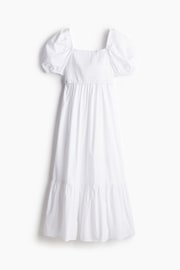 Calf-length nursing dress in crisp poplin with a unique nursing feature. Square neckline, a smocked bodice and short puff sleeves with narrow elastication over the shoulders and at the cuffs. Flared skirt with a gathered seam above the hem for added volume. The design includes a double layer at the top to help retain warmth while allowing easier nursing access.