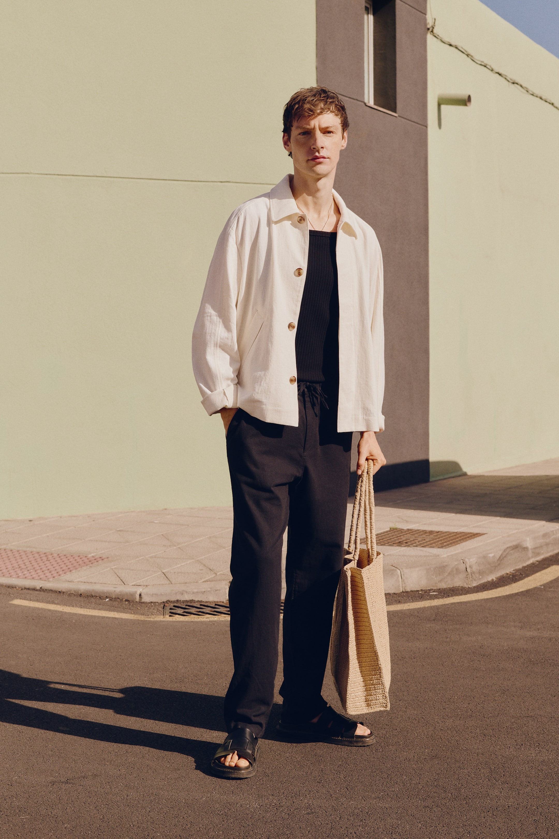 Short jacket in a soft weave made from a cotton and linen blend with a collar, concealed buttons down the front and diagonal welt pockets on the front. Regular fit for comfortable wear and a classic silhouette. Lined.