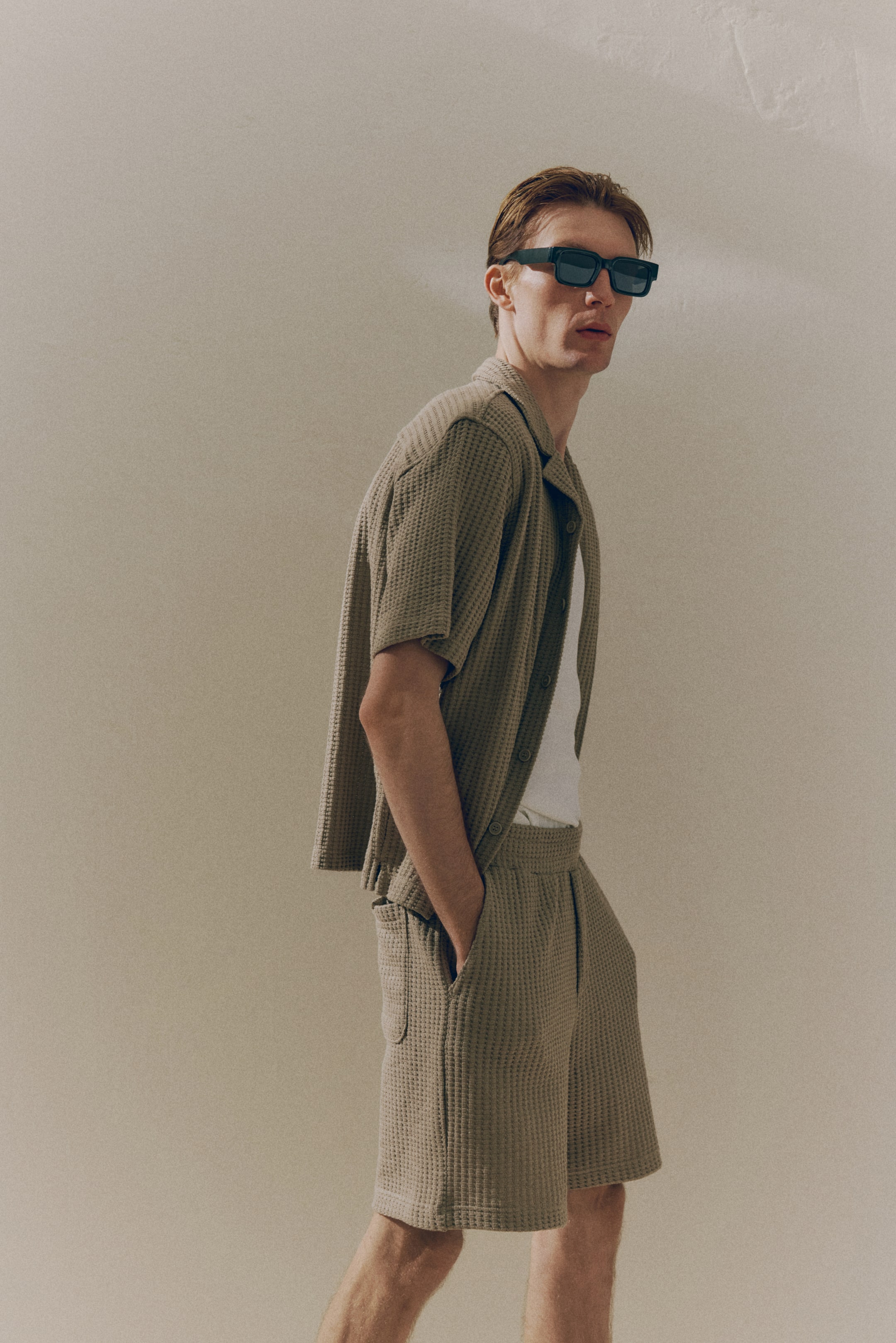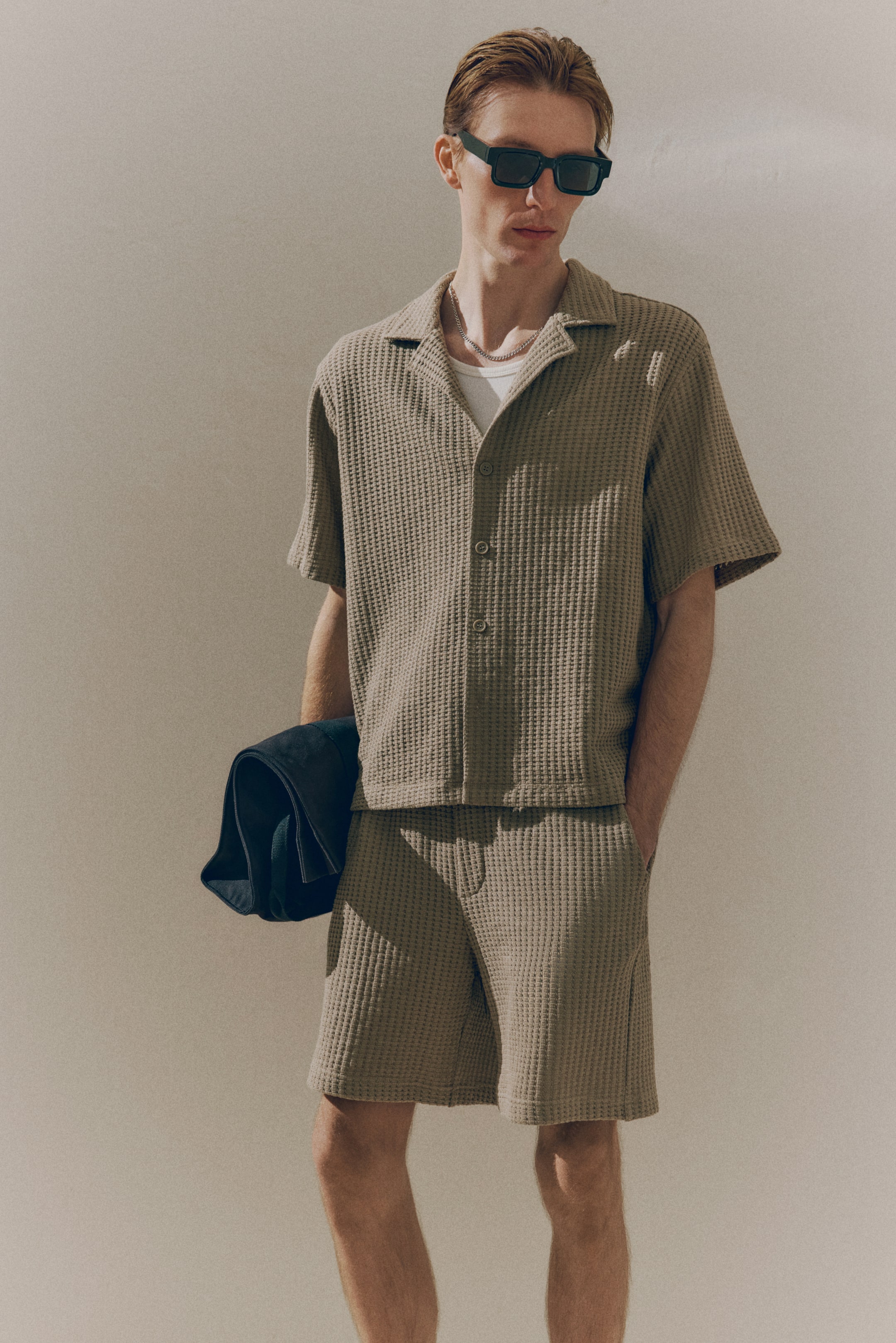 Shorts in textured cotton jersey with covered elastication and a concealed drawstring at the waist, a fake fly, diagonal side pockets and a patch back pocket. Regular fit for comfortable wear and a classic silhouette.