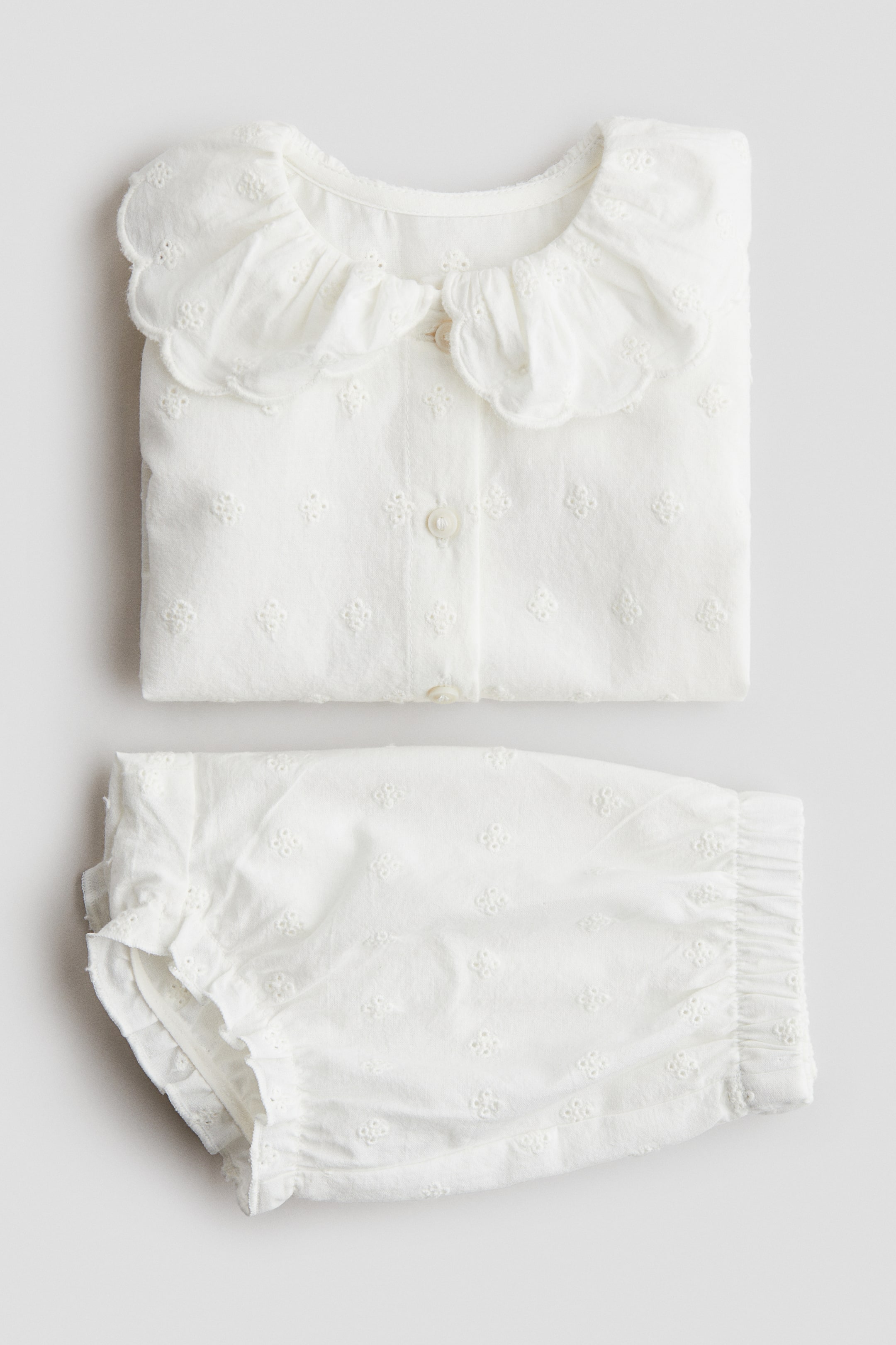 Set with a blouse and pair of bloomers in an airy cotton weave with broderie anglaise. Short sleeved blouse with a scalloped collar and buttons down the front. Bloomers with covered elastication at the waist and elasticated, frill-trimmed hems.