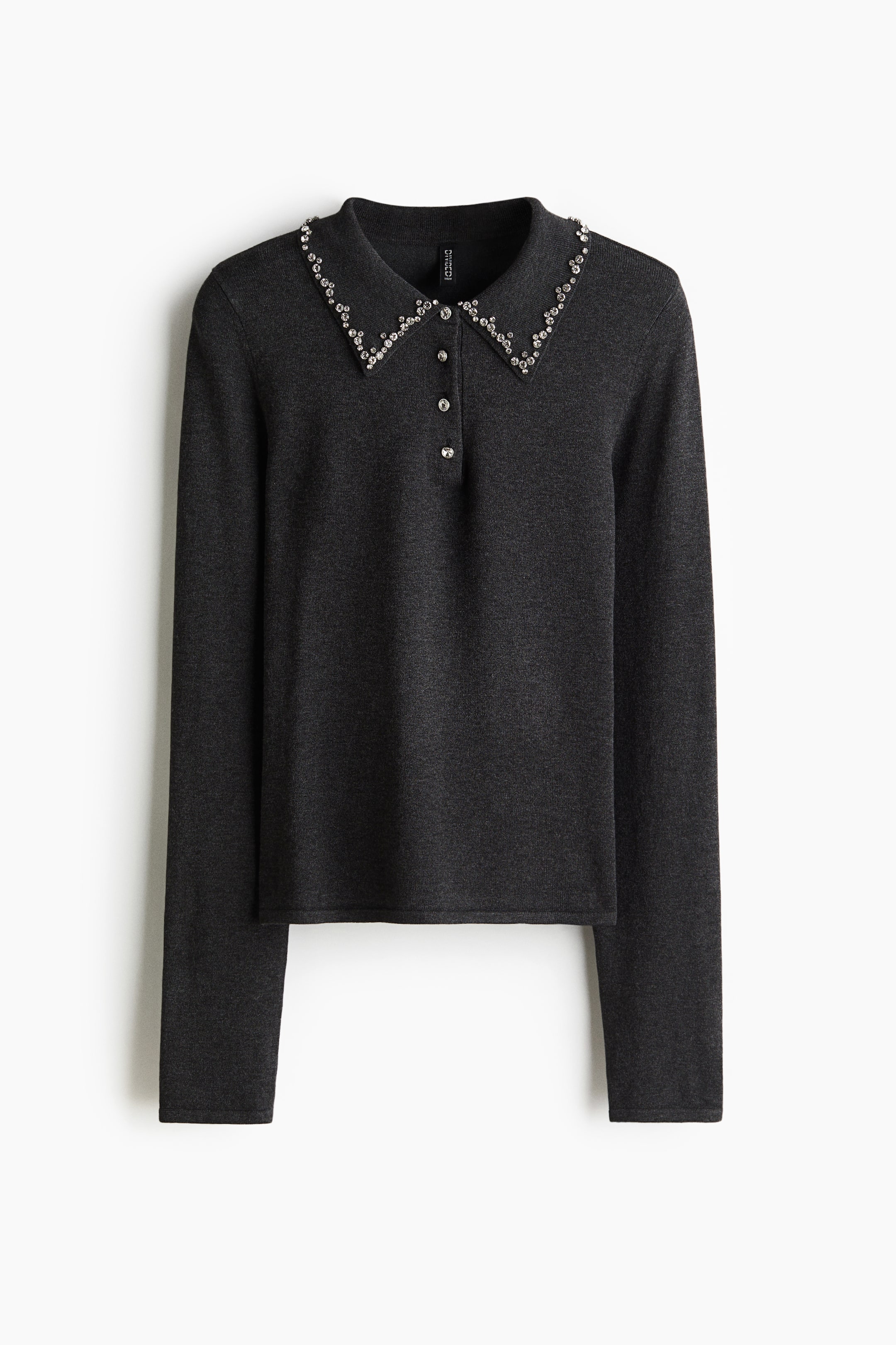 Short, fitted top in a fine knit with a rhinestone-embellished collar and matching buttons at the top. Long sleeves and a straight hem.