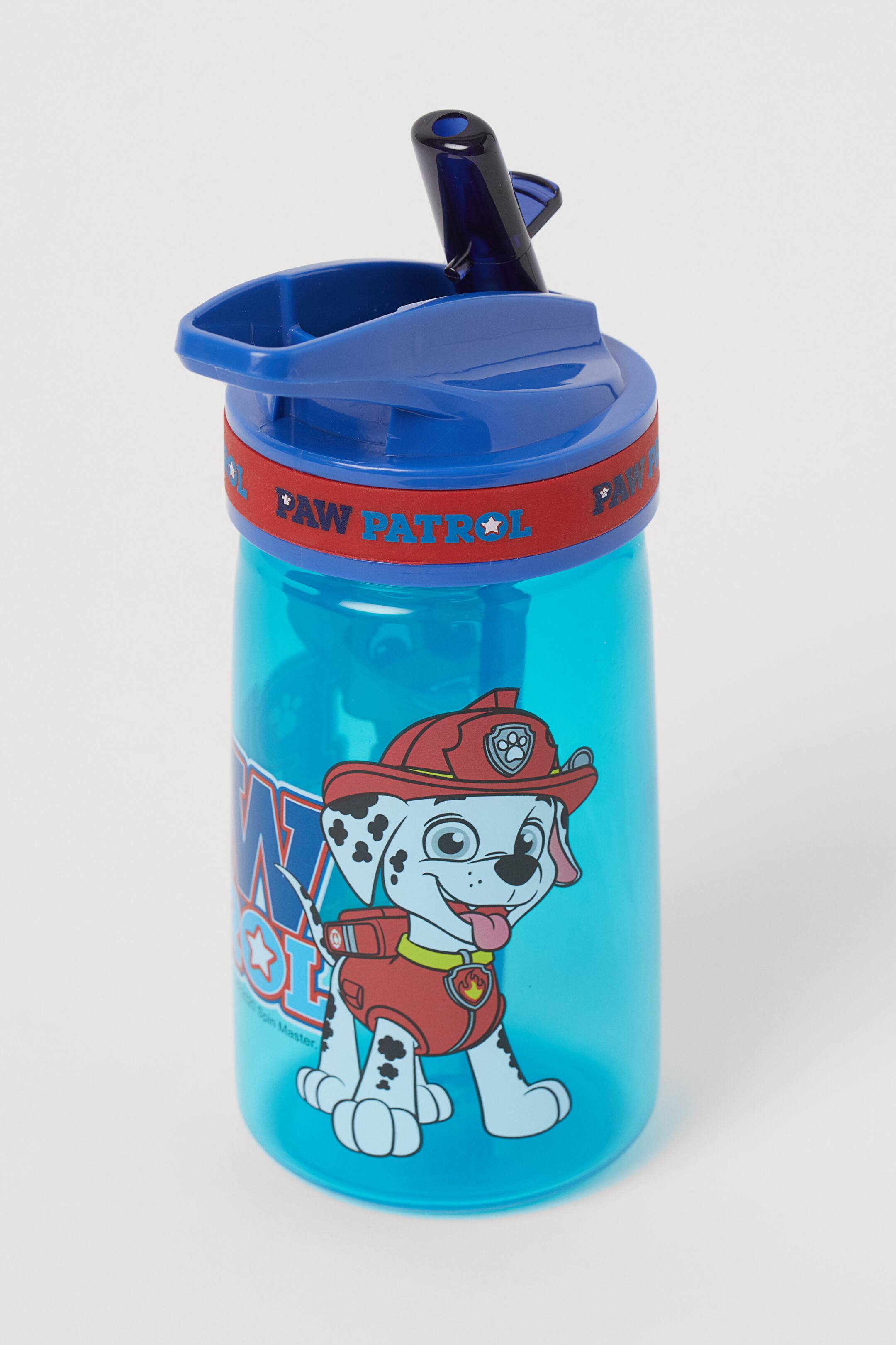 Printed plastic water bottle with a small handle and lid with a non drip spout. Capacity 450 ml.