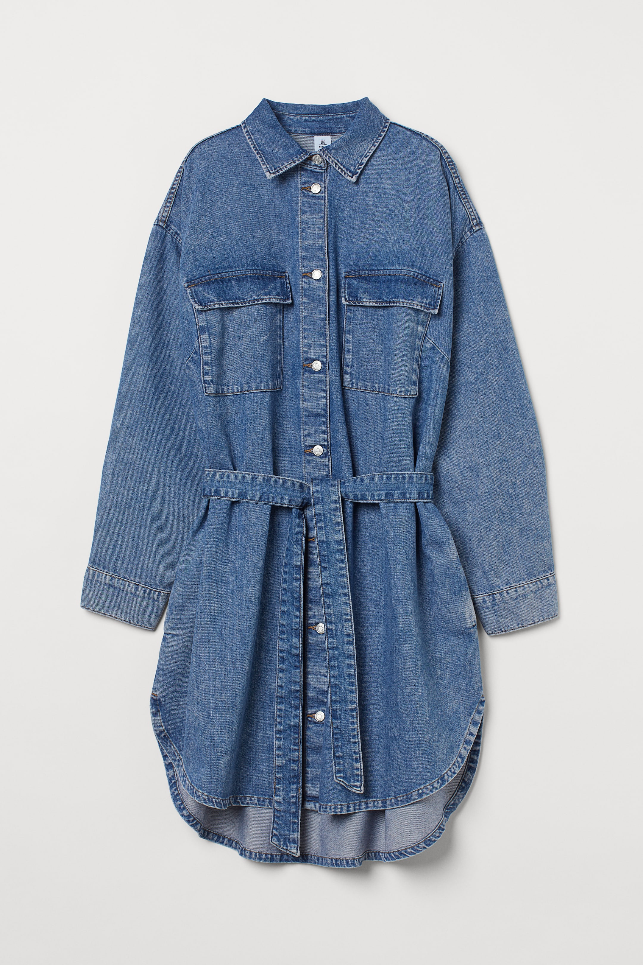 Short shirt dress in washed denim. Features a collar, buttons down the front and large flap chest pockets. Dropped shoulders and long, wide sleeves with button cuffs. Detachable tie belt at the waist and a rounded hem.