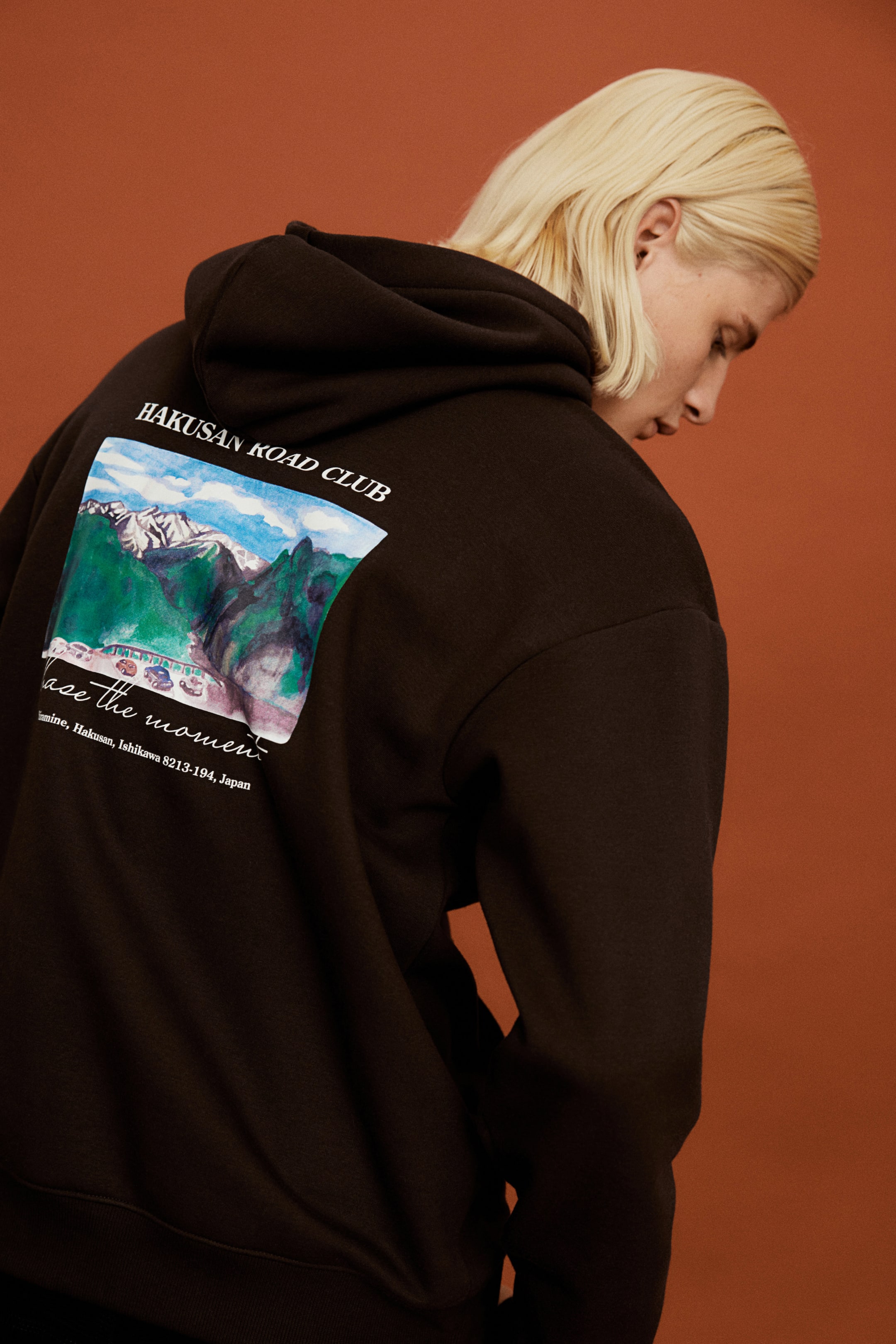 Hoodie in midweight sweat fabric made from a cotton blend with a print design. Features a double layered, wrap hood, dropped shoulders and long sleeves. Kangaroo pocket and ribbing at the cuffs and hem. Soft brushed inside. Loose fit for a generous but not oversized silhouette.