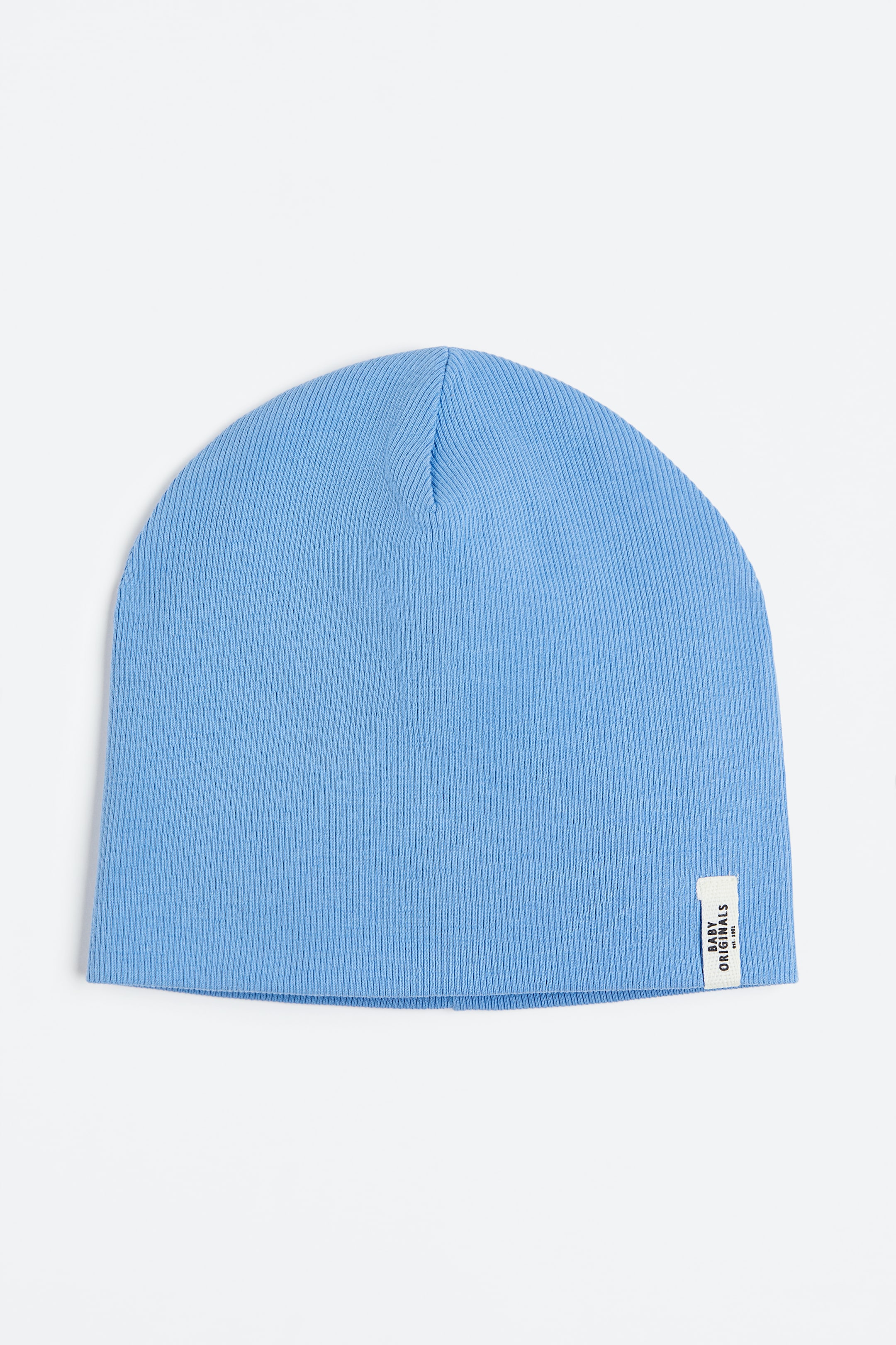 Beanie in soft, ribbed cotton jersey. Features a small fabric appliqué at the hem.