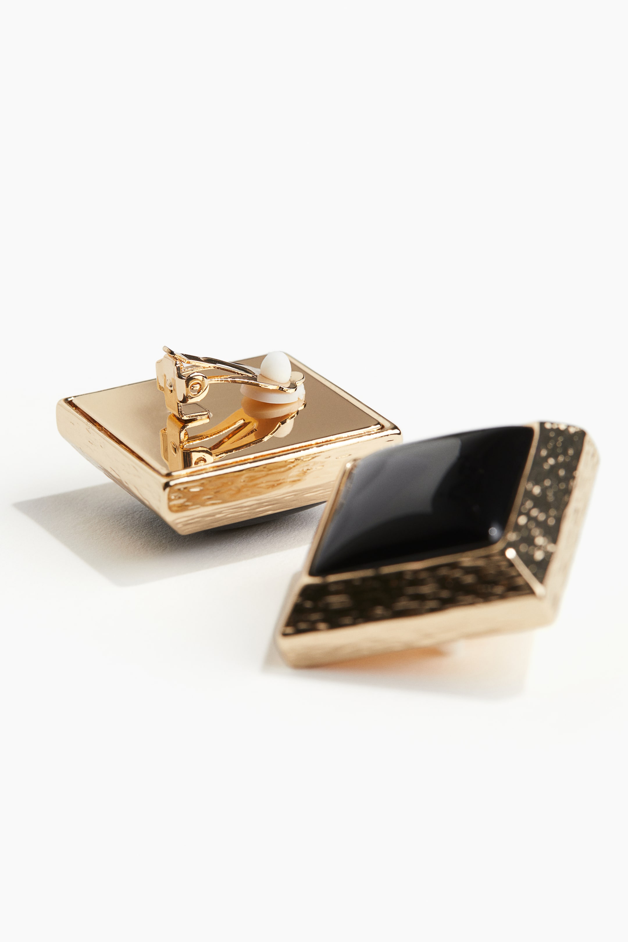 Square clip earrings in metal with a textured finish and a large plastic stone in the middle. Size approx. 3x3 cm.