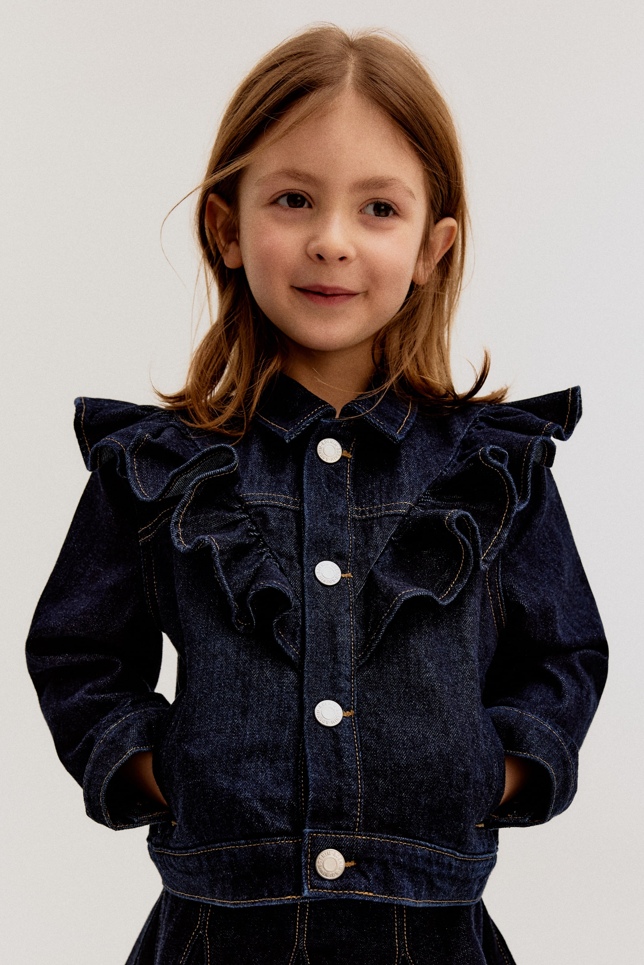 Jacket in soft cotton denim. Features a V-cut yoke with a flounced trim front and back. Turn down collar, press studs down the front and at the cuffs and welt front pockets.