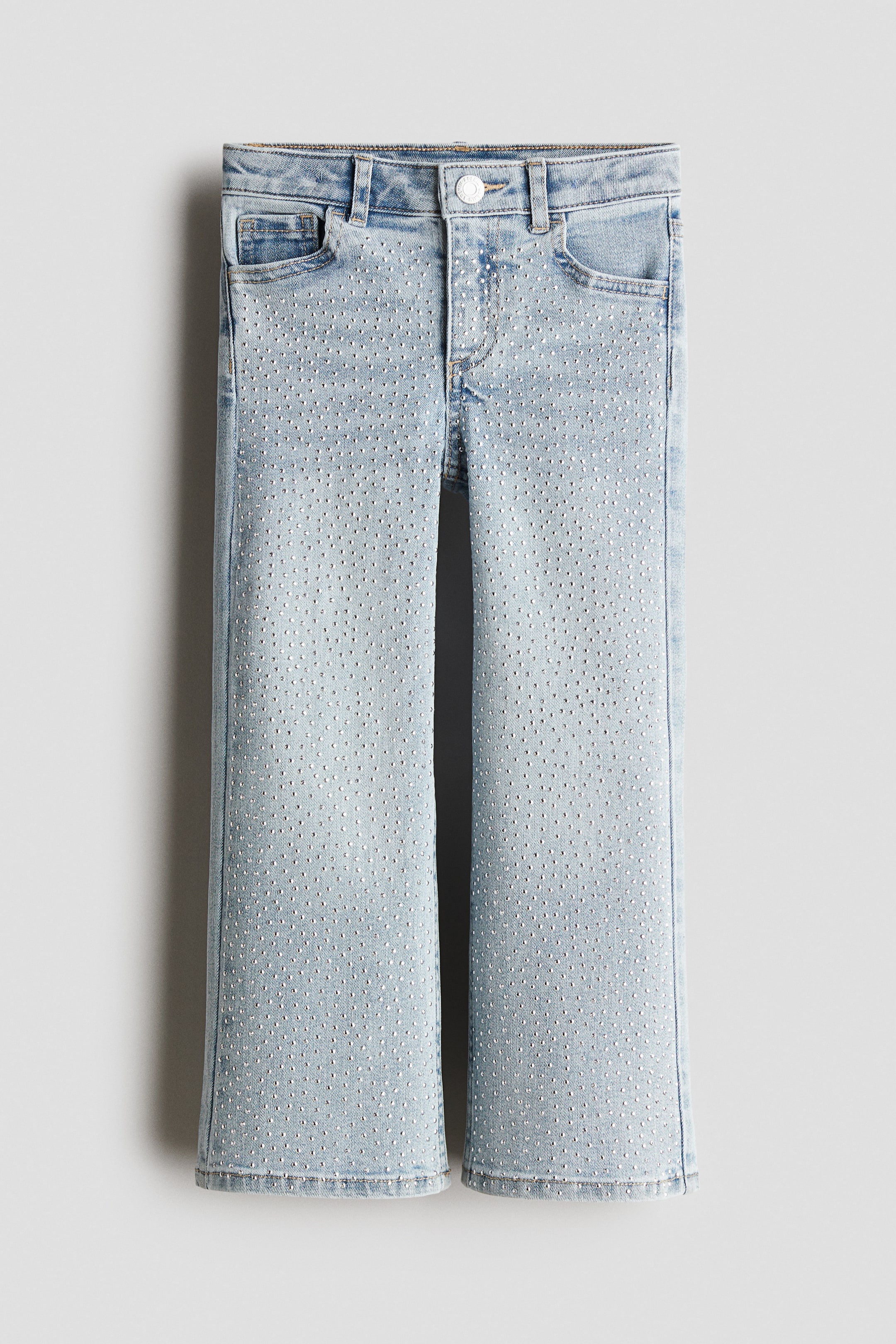 5-pocket jeans in soft denim. Featuring a regular fit through the hips and thighs and wide legs covered in decorative studs on the front side. Adjustable elastication at the waist and a zip fly with a press stud.