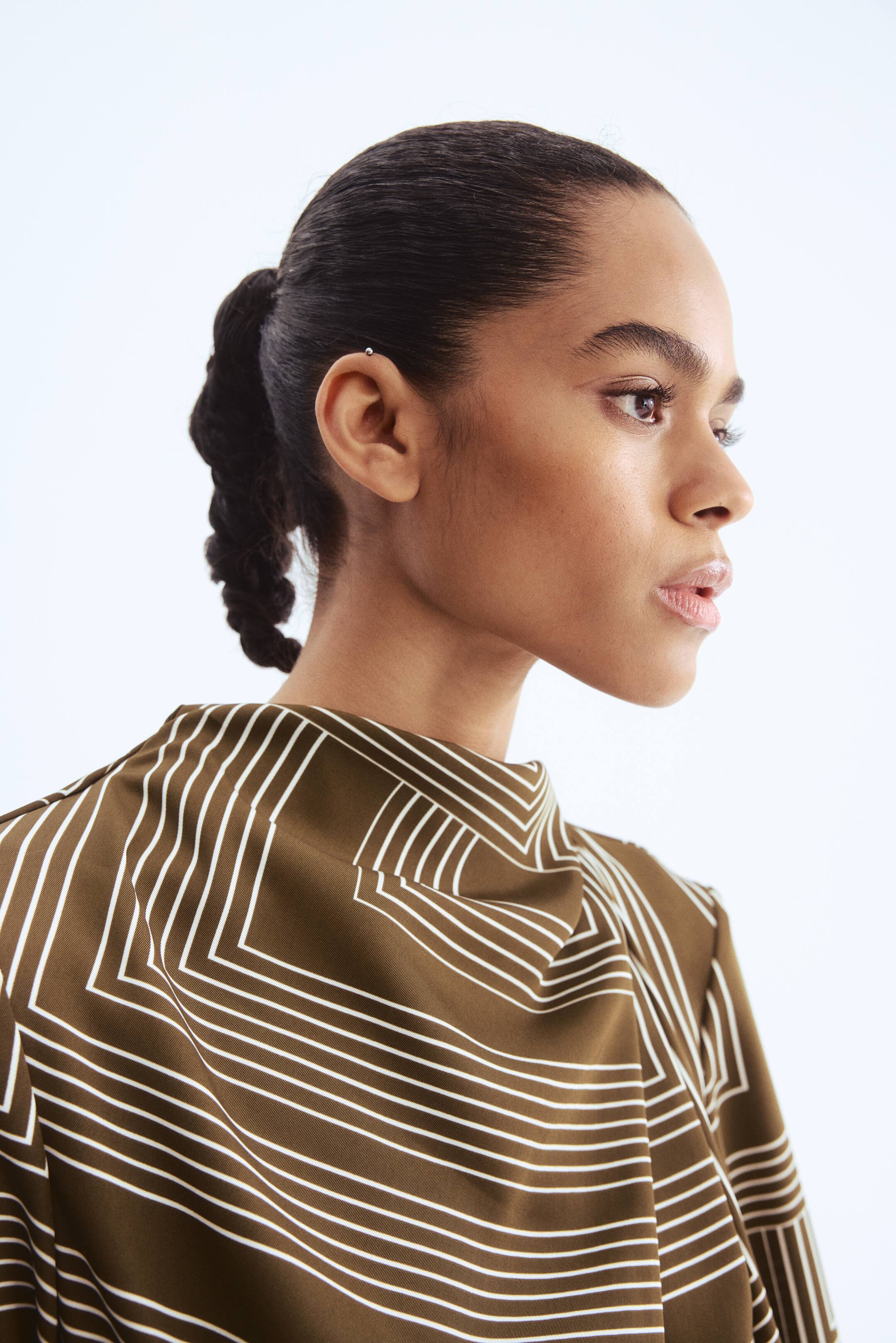 Short dress in twill with a slight sheen and an all over pattern. Features a stand collar with pleats on one side that create draping from the neckline to the hem. Long sleeves with a slit and a button at the cuffs. Concealed zip and hook and eye fastener at the back. Unlined.