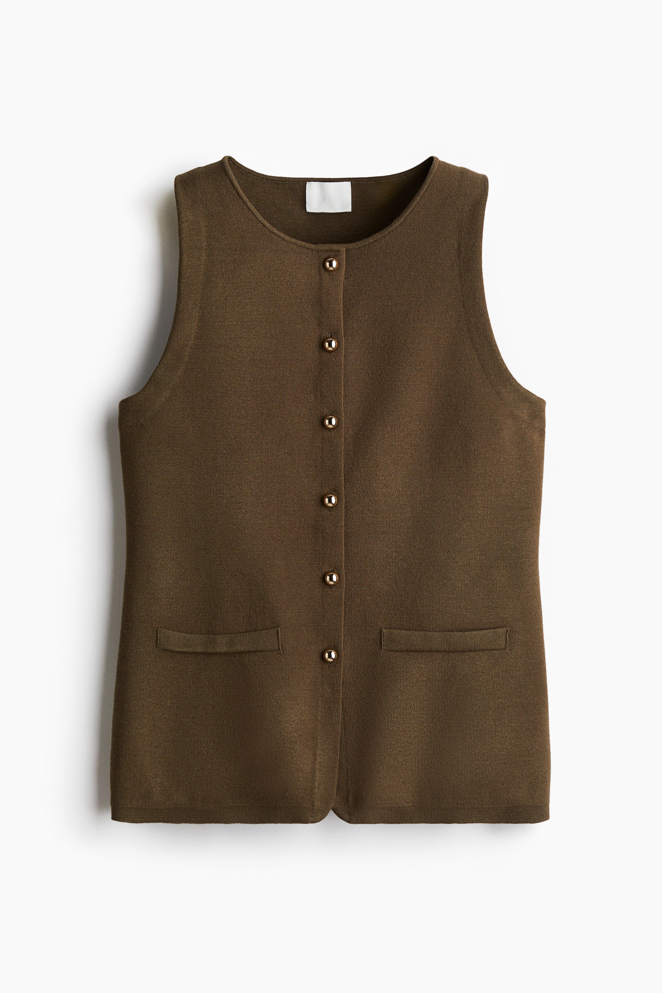 Long vest in a dense knit. Features a round neckline and metal buttons and mock welt pockets on the front.