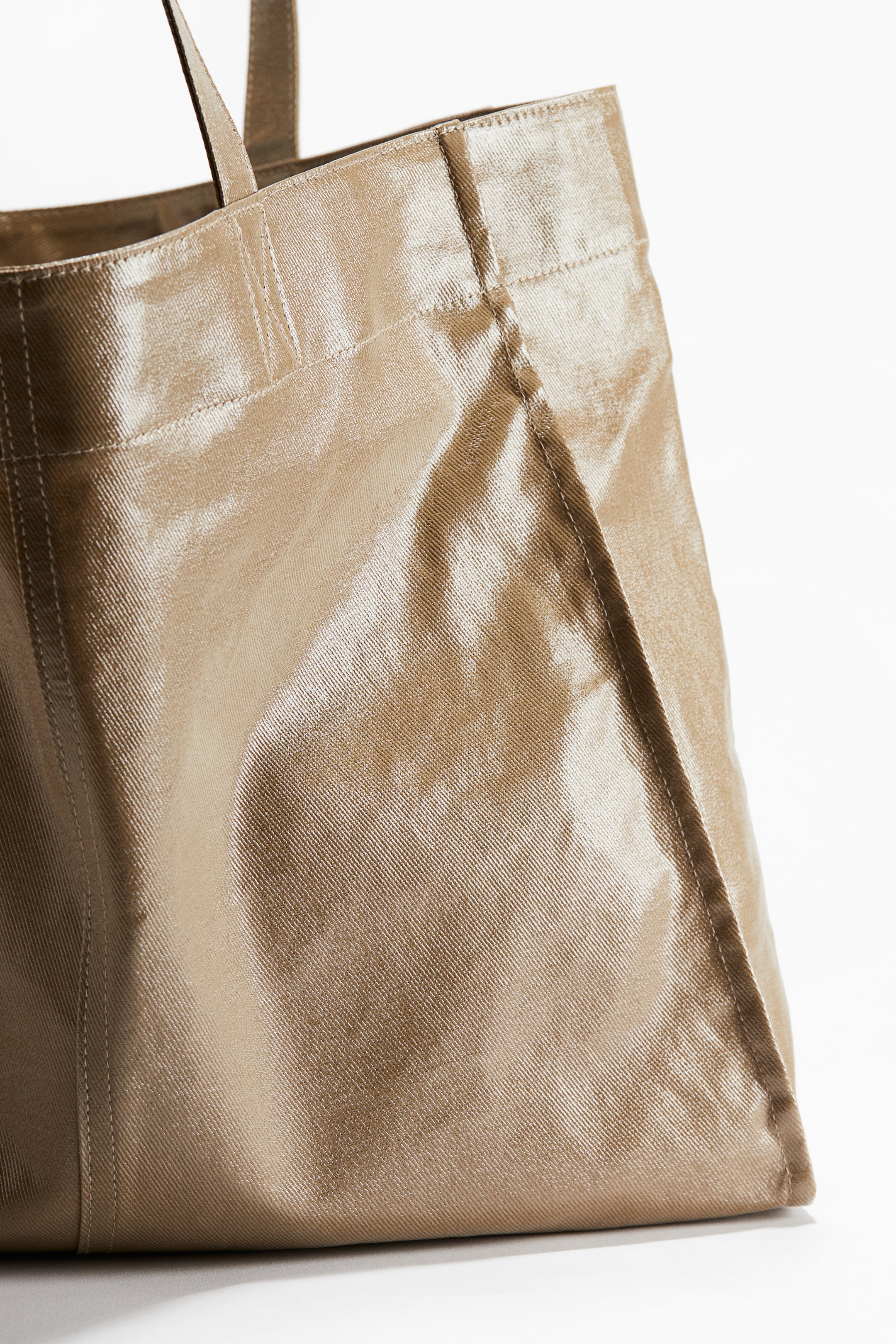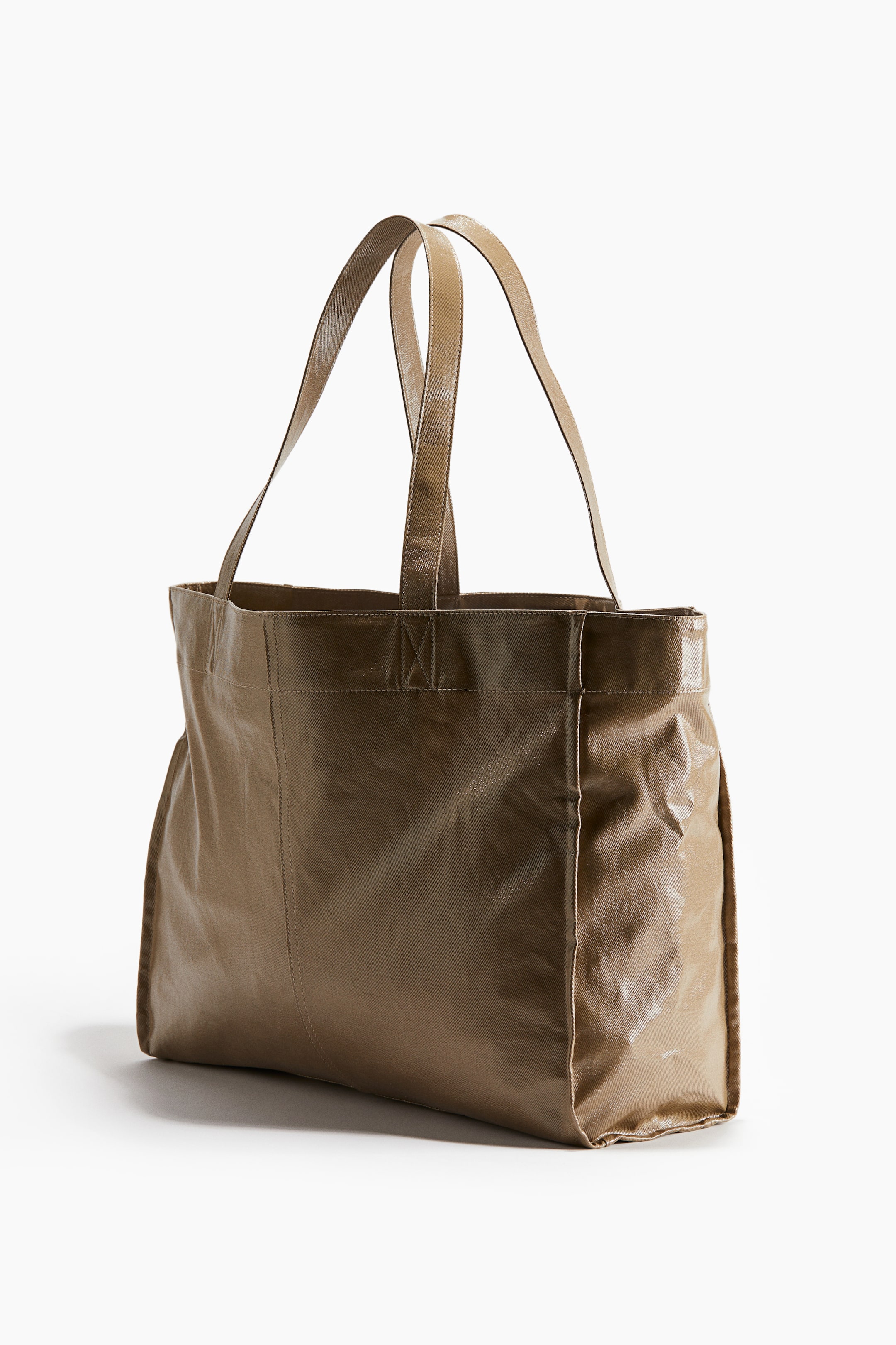 Rectangular shopper in coated fabric. Features handles at the top and one zipped inner pocket. No fasteners. Lined.