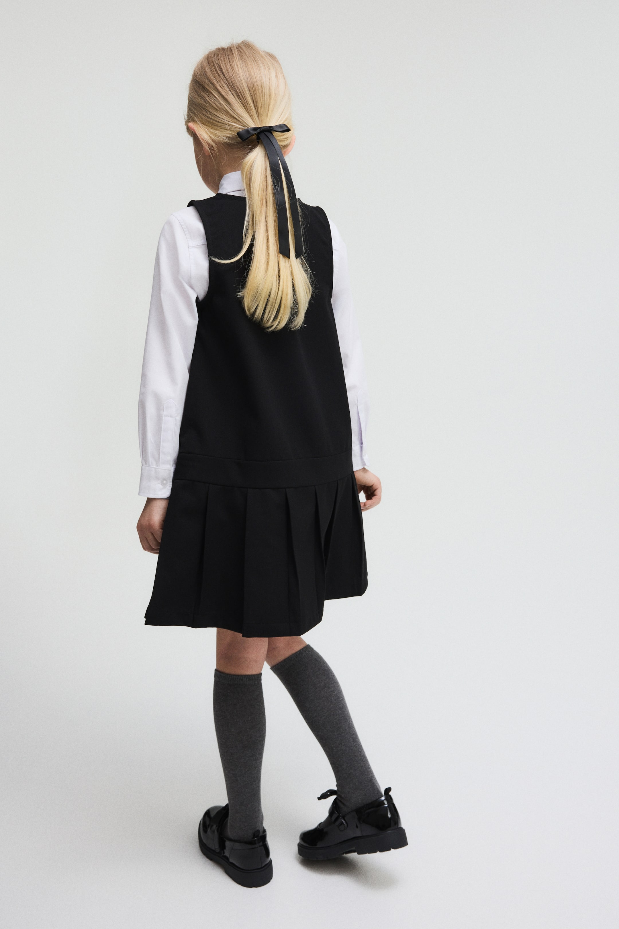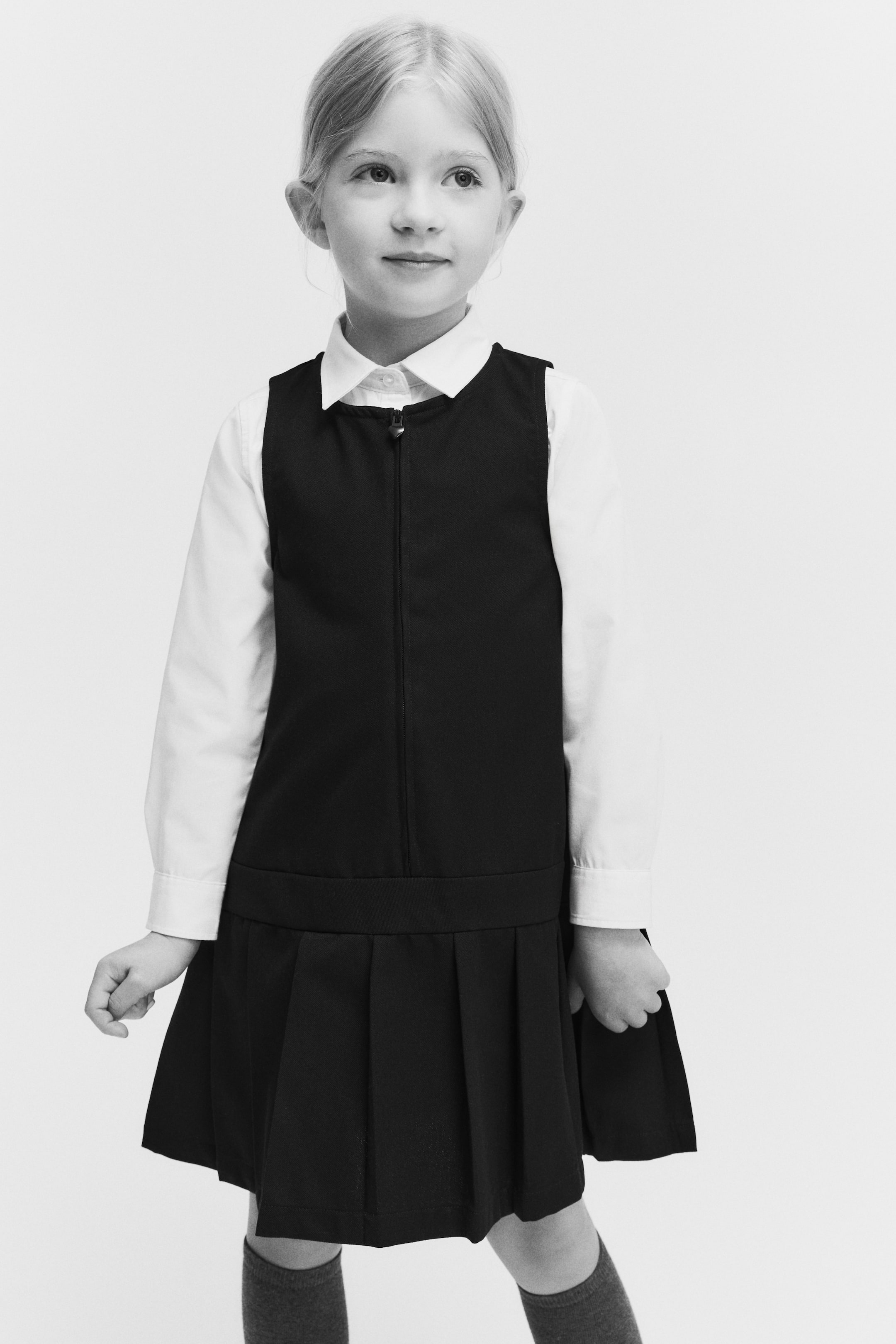 Sleeveless, A-line dresses in woven fabric. Round neckline and a concealed zipper at front with a heart-shaped pull tab. Wide trim at hips and a pleated skirt. Unlined.