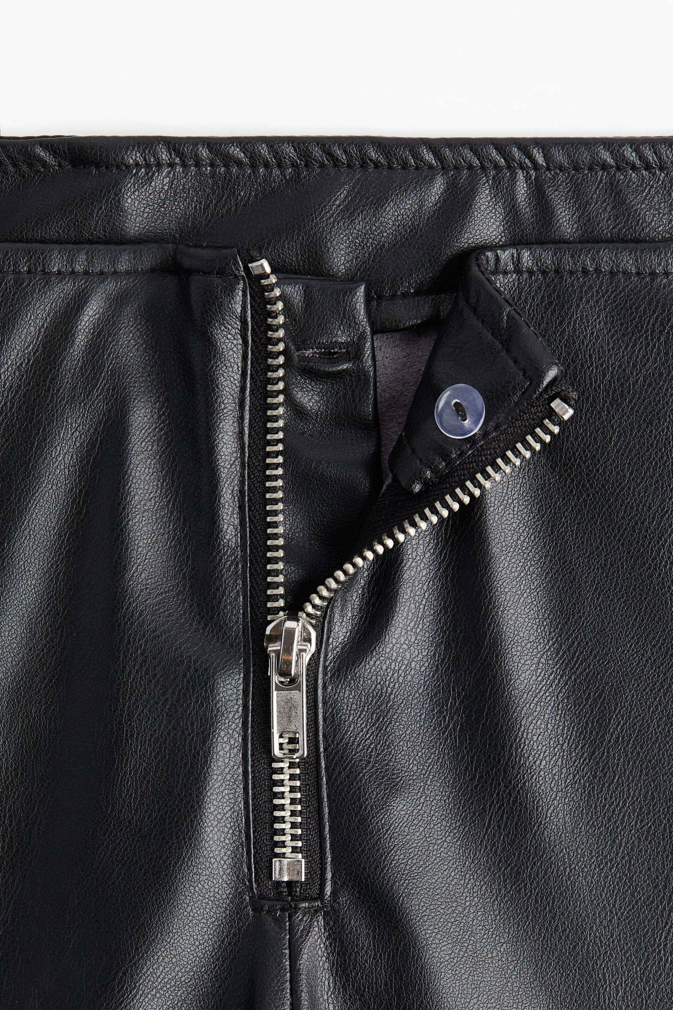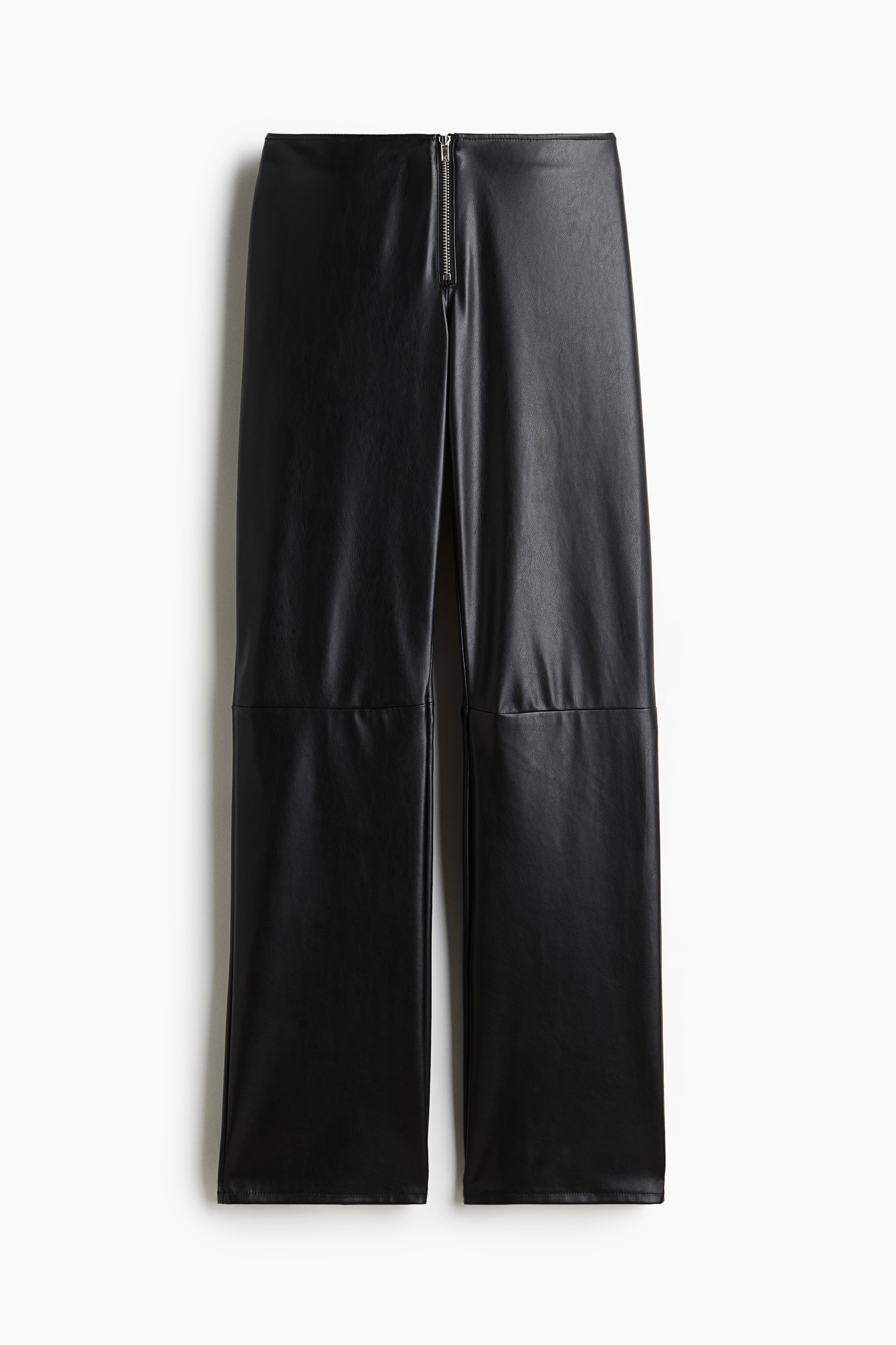 Fitted pants in coated fabric. Visible zip fly with concealed button, visible seam below knees, and flared hems.