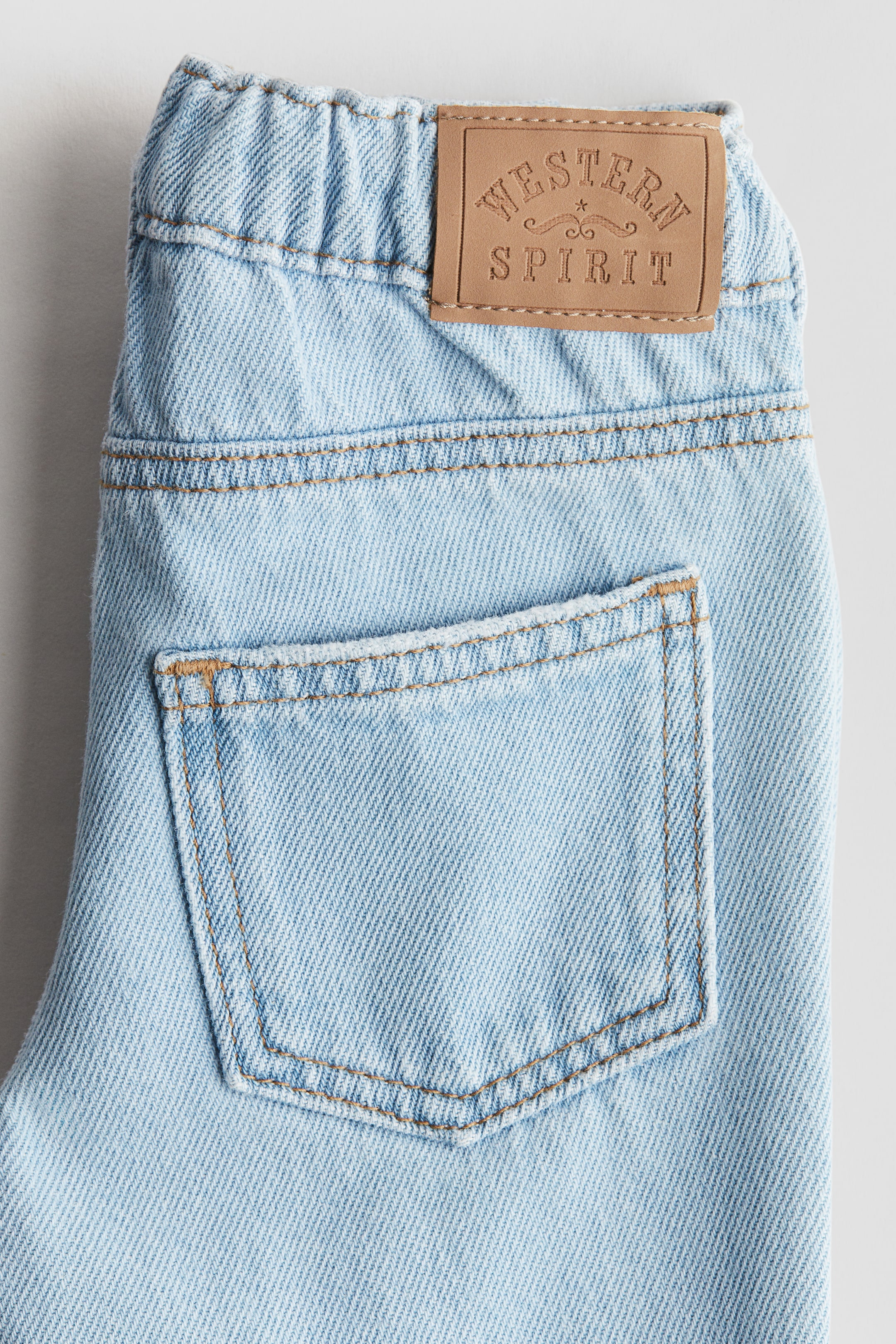 Jeans in soft cotton denim. Regular fit through hip, thigh, and leg. Adjustable, elasticized waistband and mock fly with snap fastener. Mock front pockets and regular back pockets.