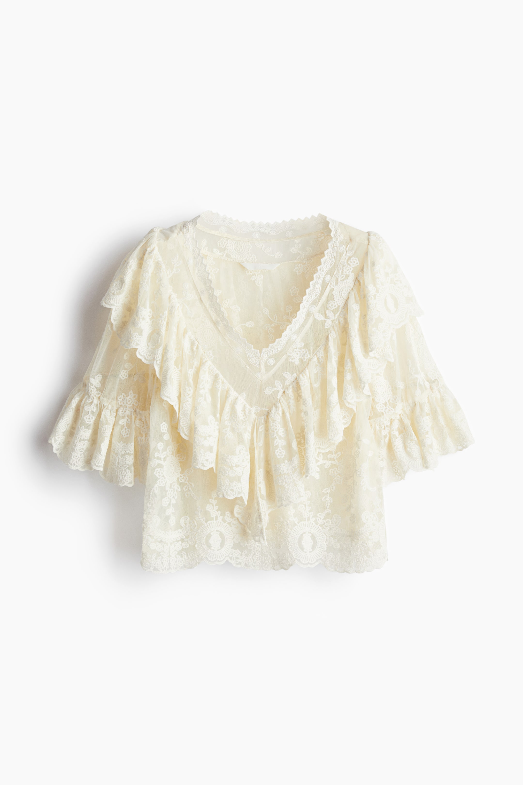 Blouse in lace. V-neck with wide, flounced trim extending over shoulders to back. Elbow-length sleeves.