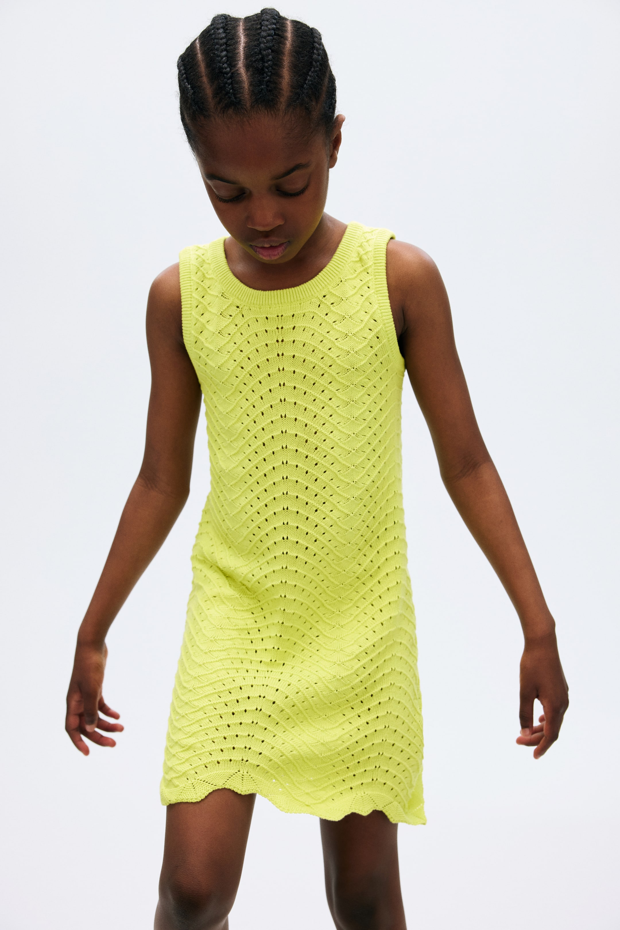 Sleeveless, textured-knit A-line dress in soft cotton. Ribbed trim at neckline and armholes.