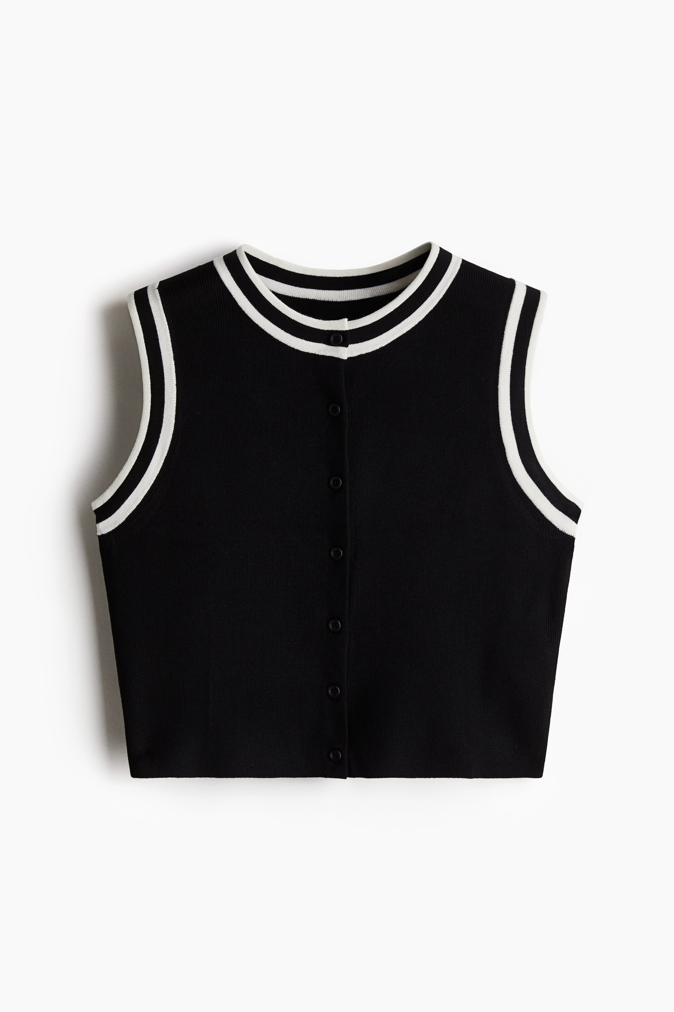 Short sweater vest in a soft, fine knit. Round neckline, buttons at front, and striped trim at neckline and armholes.