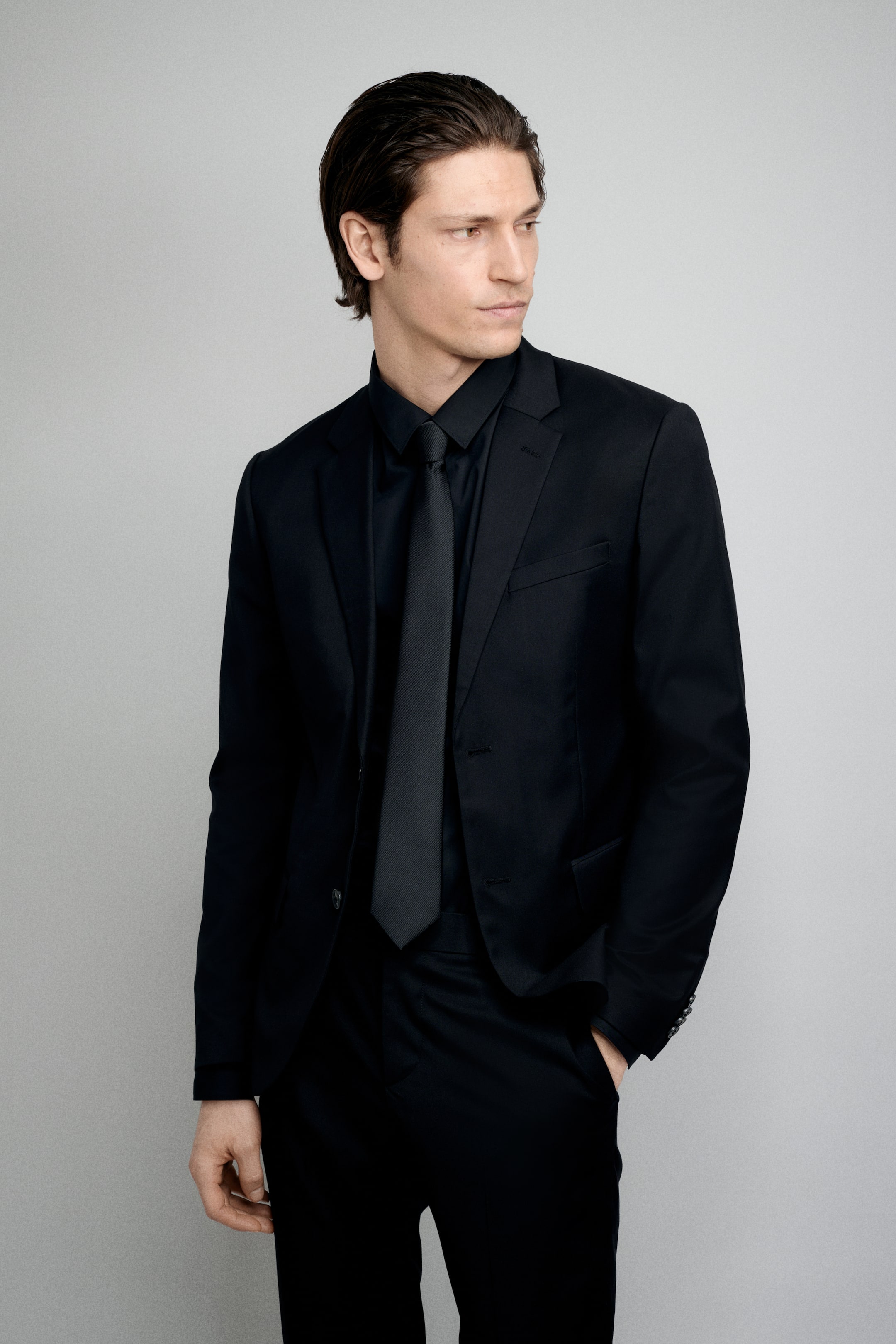 Skinny-fit, single-breasted jacket in soft, woven fabric with a fitted silhouette. Notched lapels, decorative buttonhole, chest pocket, front pockets with flap, and two inner pockets. Decorative buttons at cuffs and a vent at back. Lined.