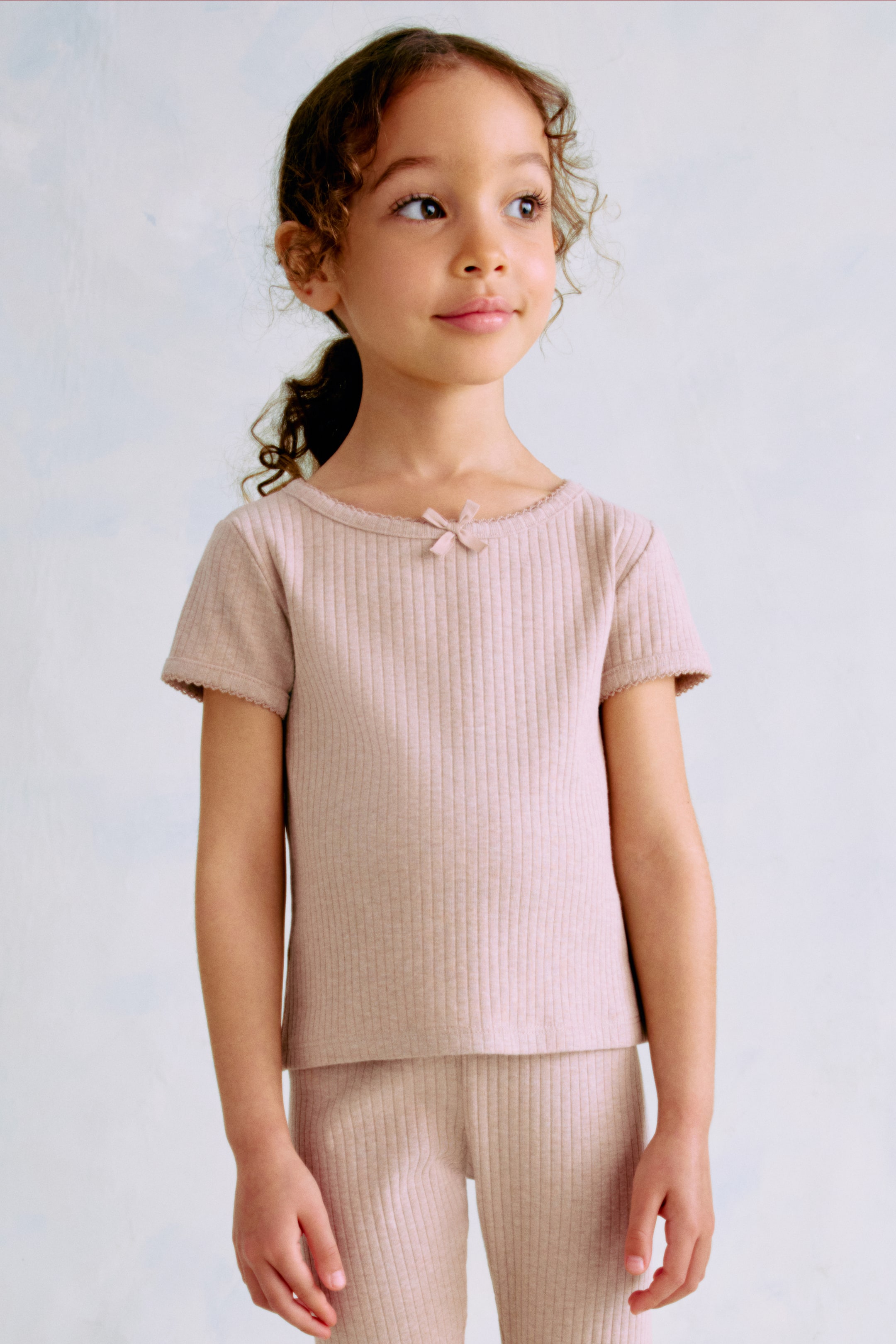 H&M Adorables. Short-sleeved tops in soft, ribbed jersey made from high-quality cotton with delicate picot trim. Round neckline with a small, decorative bow in satin. Our cotton jersey has a high GSM for thicker, more durable quality without compromising on comfort. The H&M Adorables collection is a curated selection of high-comfort, quality pieces with a timeless appeal.