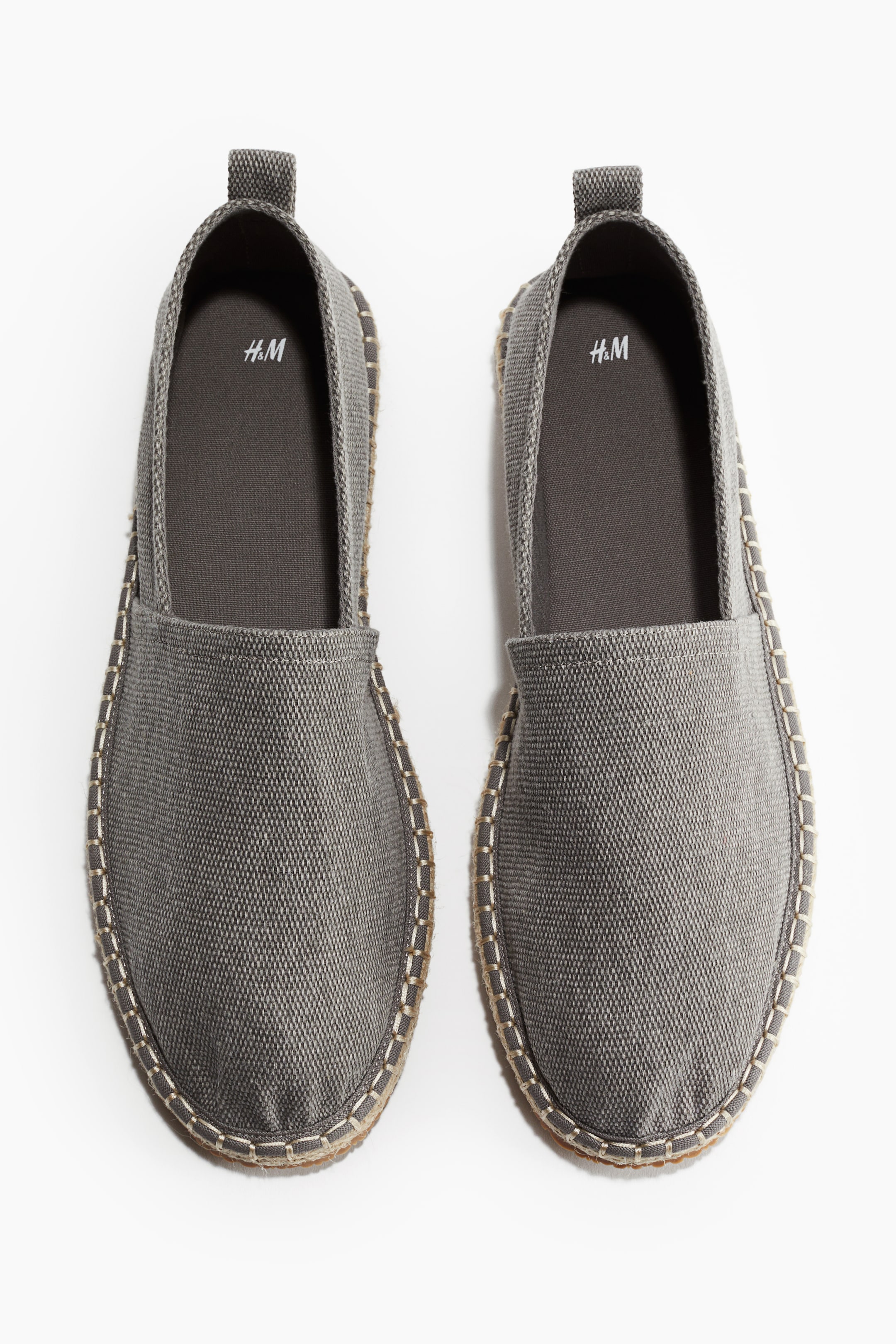 Espadrilles in canvas with braided jute trim around soles. Loop at back. Canvas lining, canvas insoles, and patterned soles.