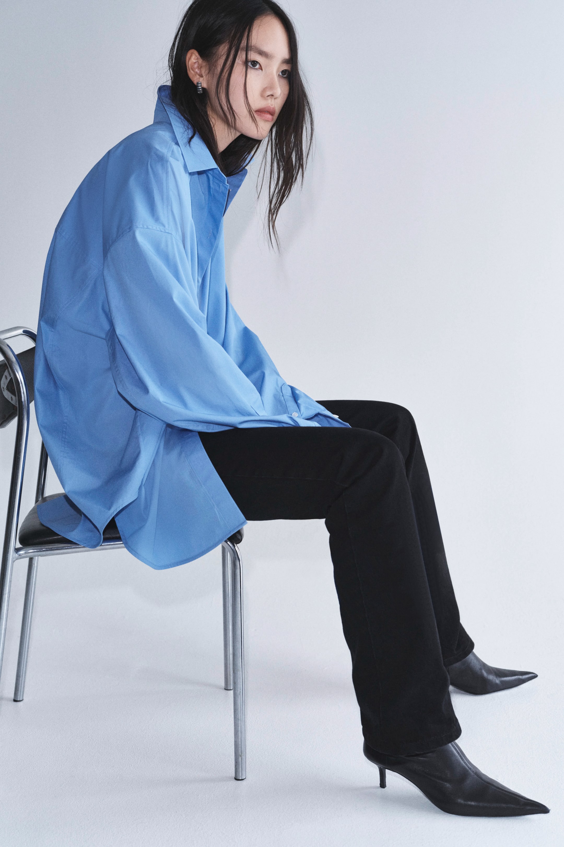 Loose-fit shirt in crisp cotton poplin. Pointed collar, buttons at front, and a double-layered yoke. Dropped shoulders, long, wide sleeves with a sleeve placket and link button, and a button at cuffs. Curved hem with high side vents. Slightly longer at back.