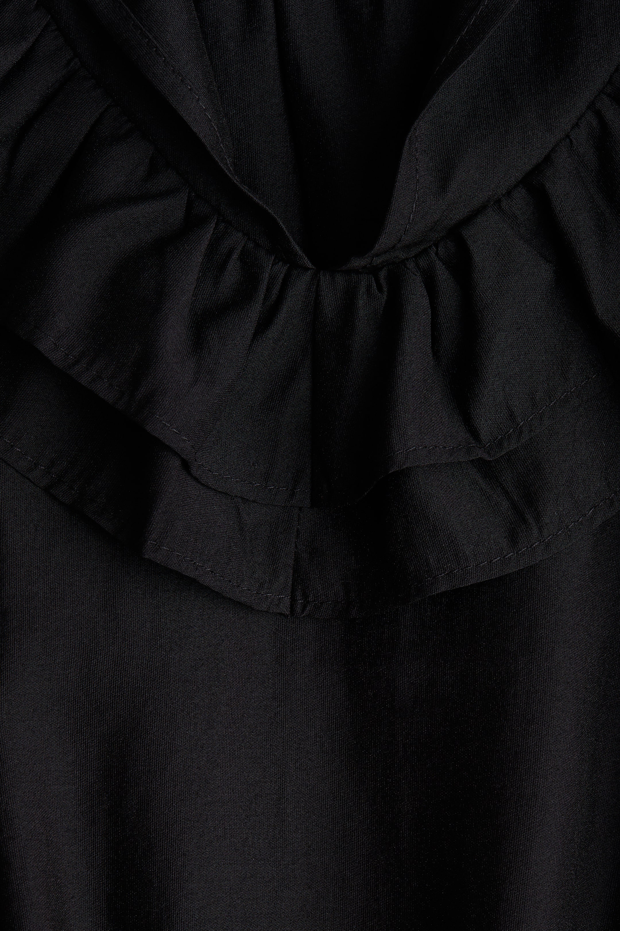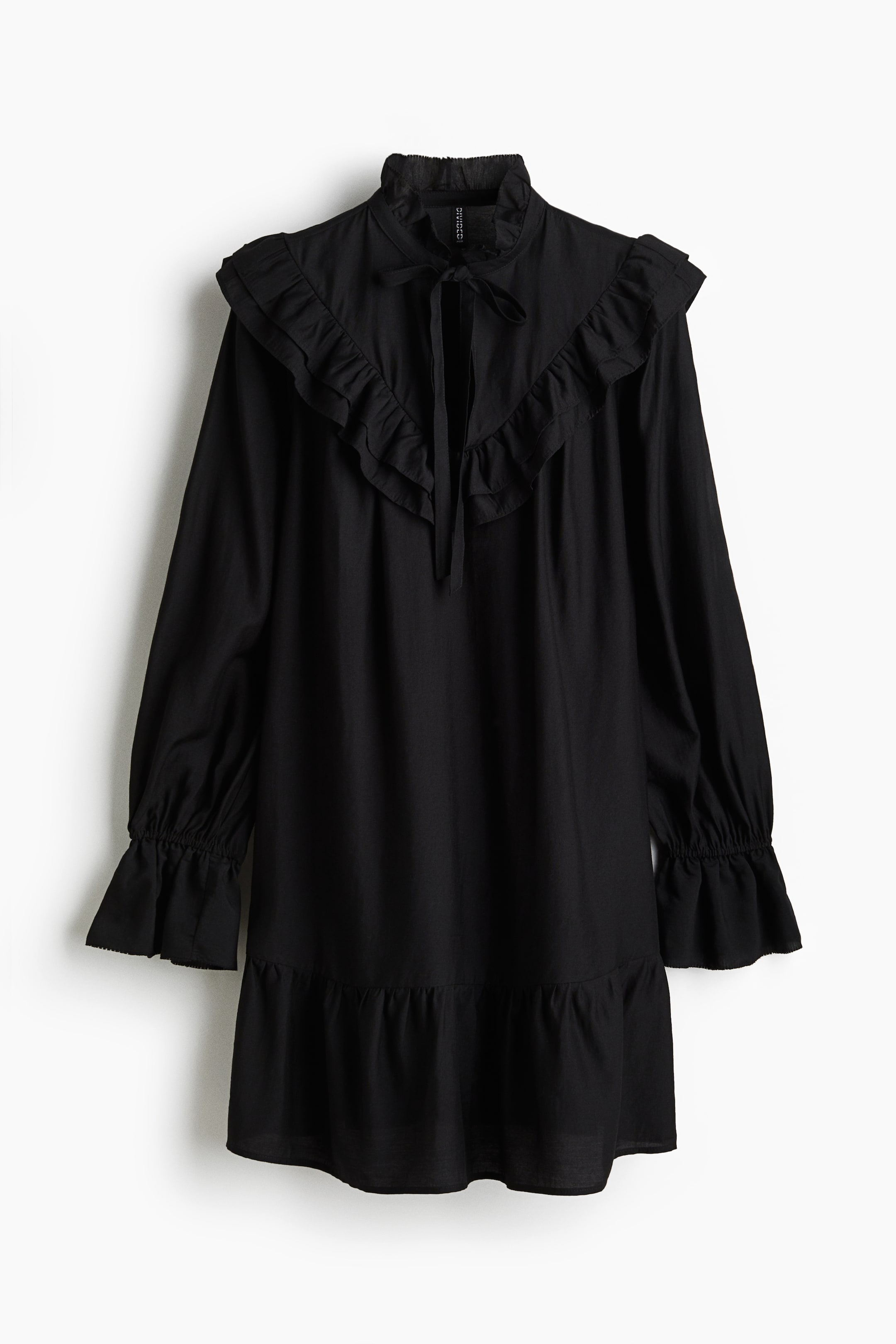 Short, loose-fit dress in a woven viscose blend. Ruffle-trimmed band collar, slit at top with narrow ties, and a V-shaped yoke at front and back with double-layered ruffle trim. Long sleeves, flared cuffs with narrow elastic at wrists, and a gathered seam above hem. Unlined.