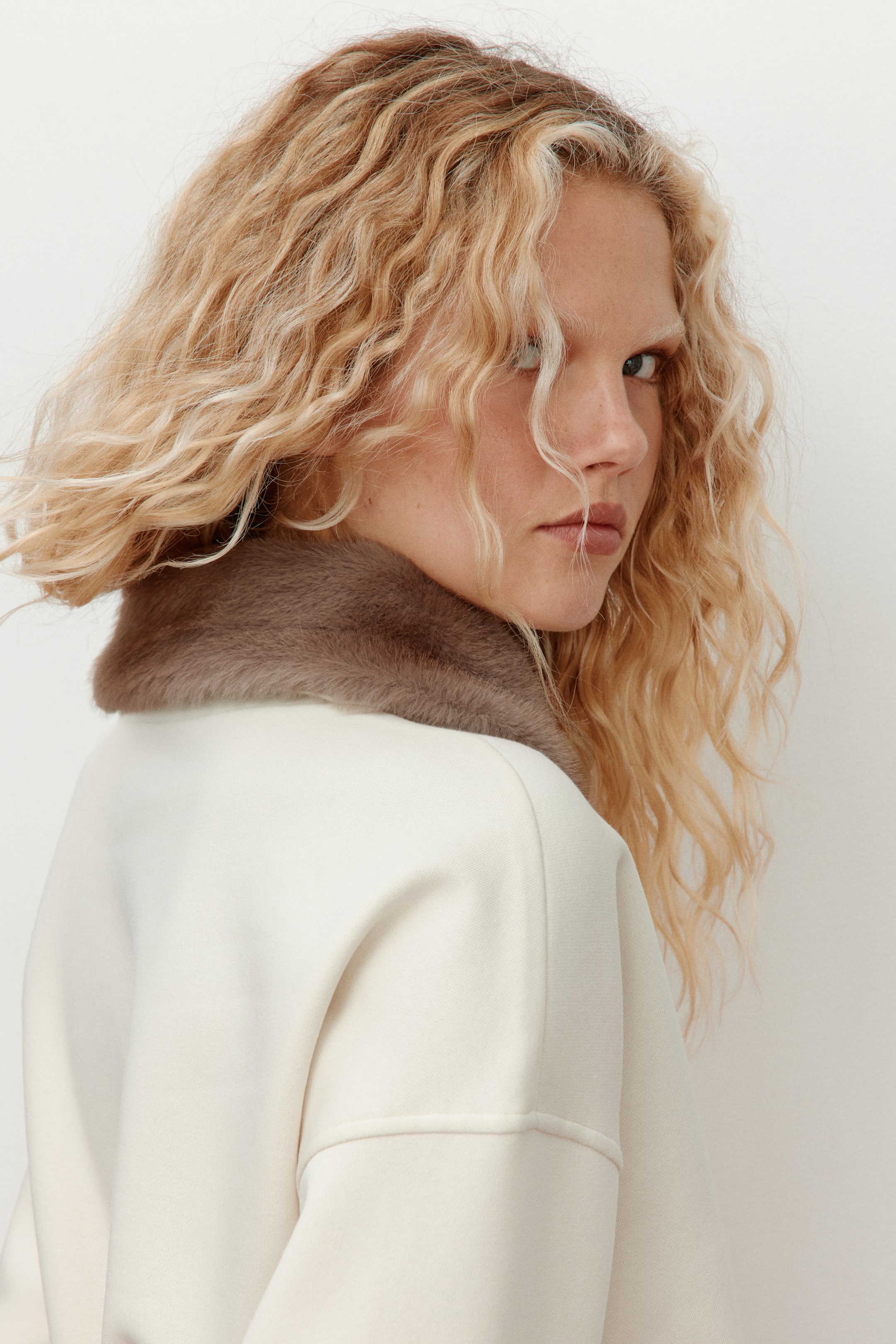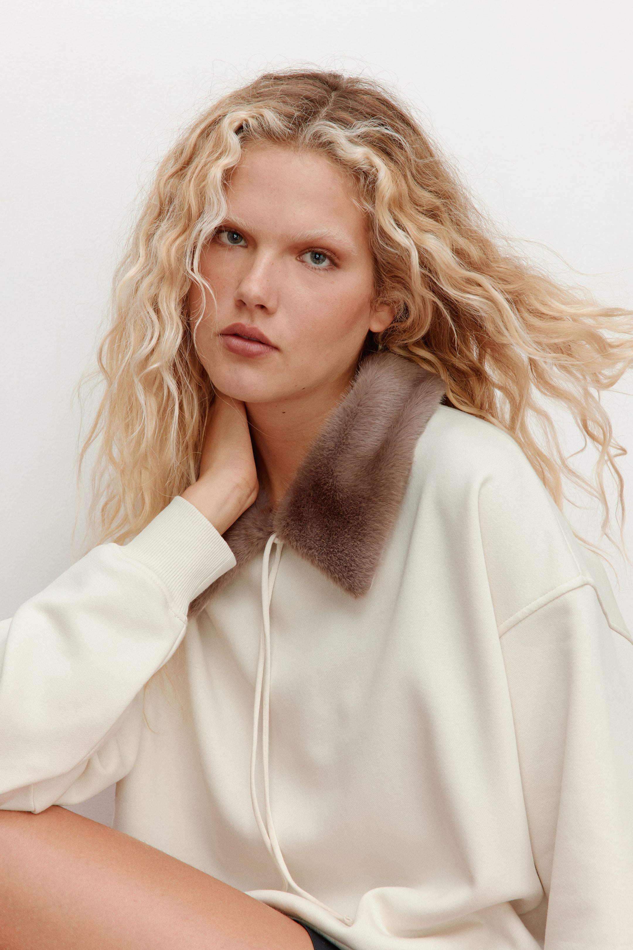 Oversized sweatshirt with collar in fluffy fabric and a soft, brushed inside. Narrow ties at front, dropped shoulders, and long sleeves. Ribbing at cuffs and hem.