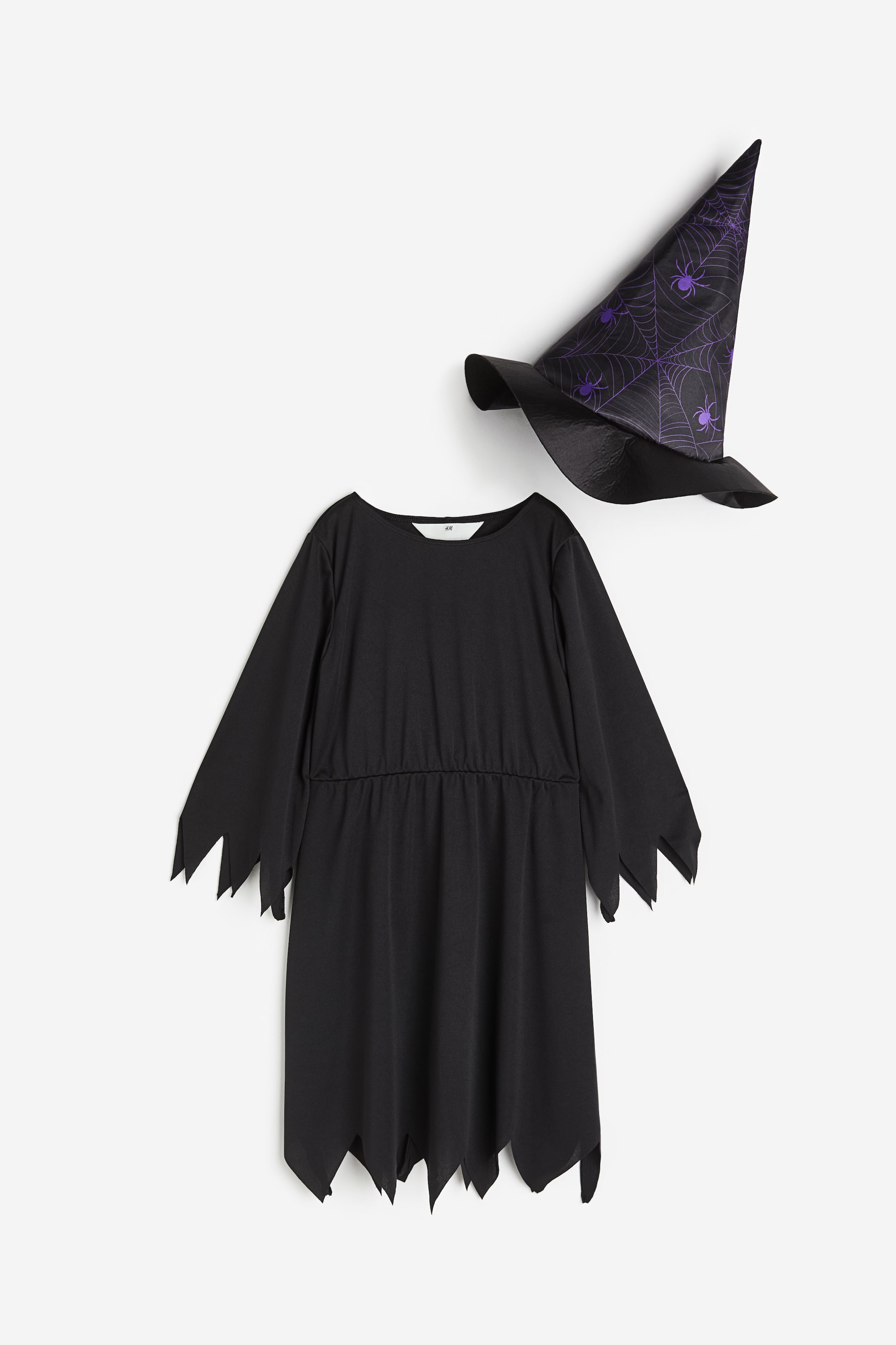 Fancy dress costume in soft jersey with an elasticated seam at the waist and zigzag edges at the cuffs and hem. Witch's hat with an all-over print.