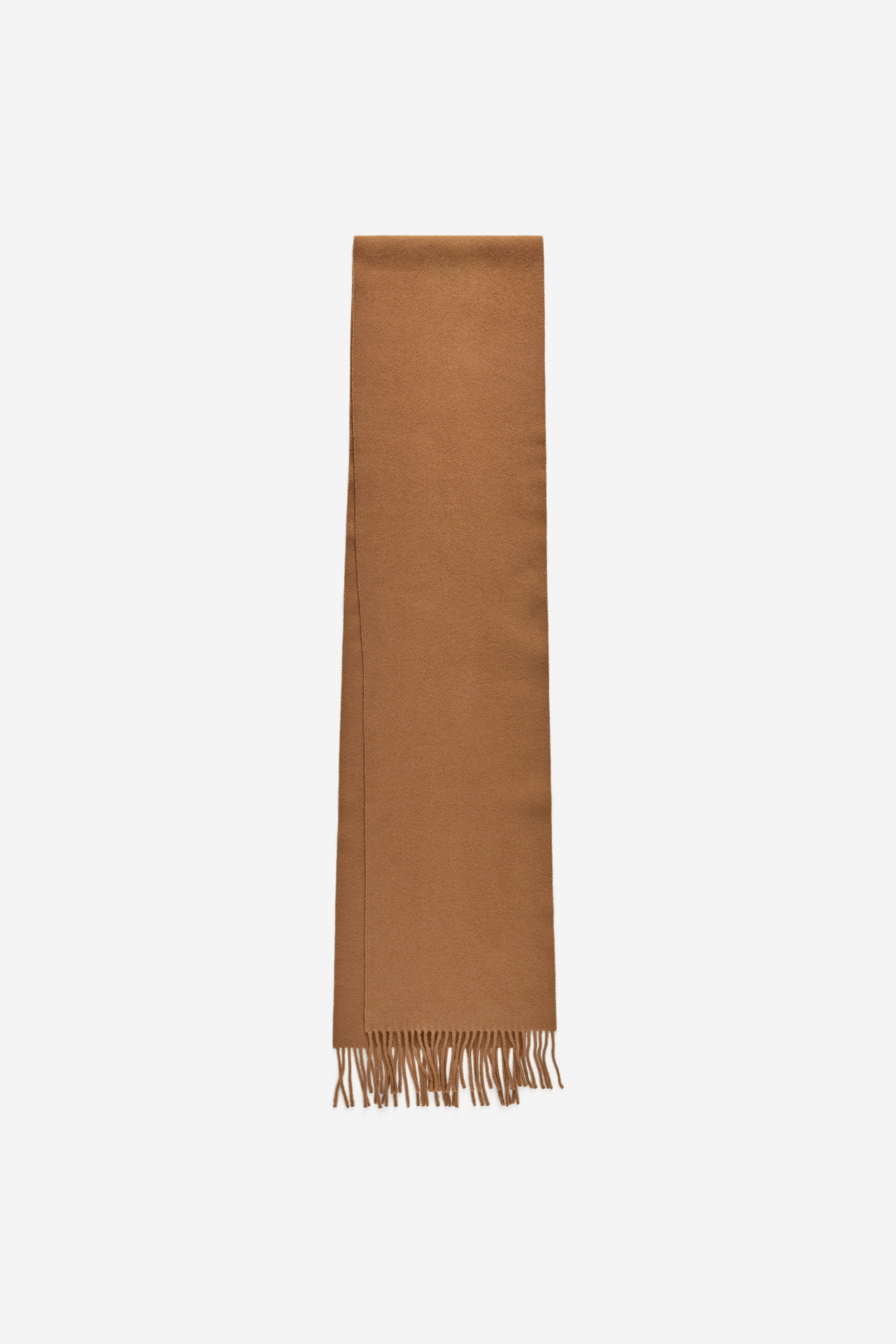 Scarf densely woven from wool. Detailed with fringes along the shorter edges. Measurements 27 cm x 250 cm.