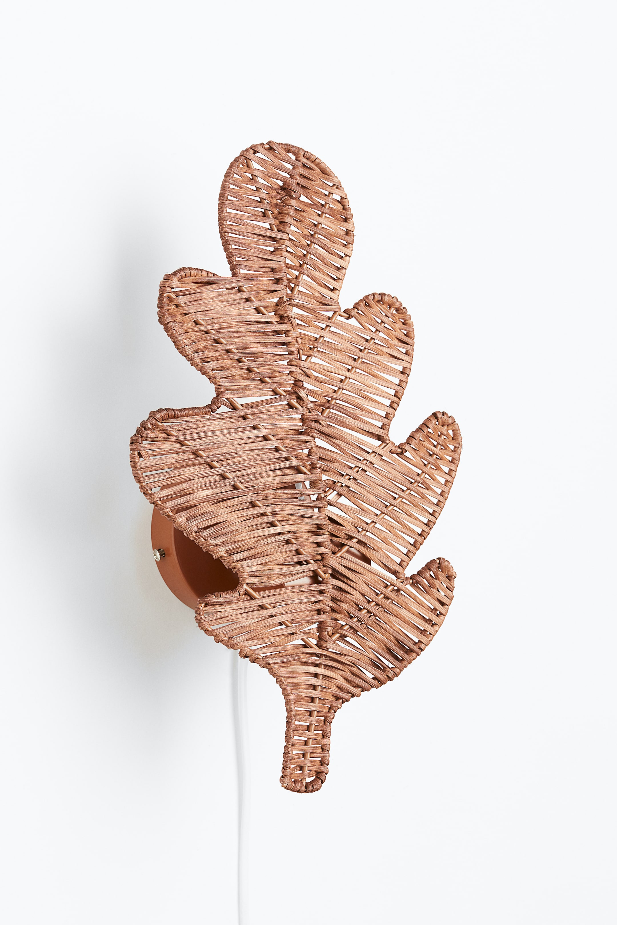 Wall lamp in rattan shaped like an oak leaf with a reflector that diffuses a warm, ambient light into the room. Metal wall mount and cord with a plastic switch. E14 bulb holder. Max. 6 W LED. Bulb not included. Depth 9 cm. Height 35 cm.