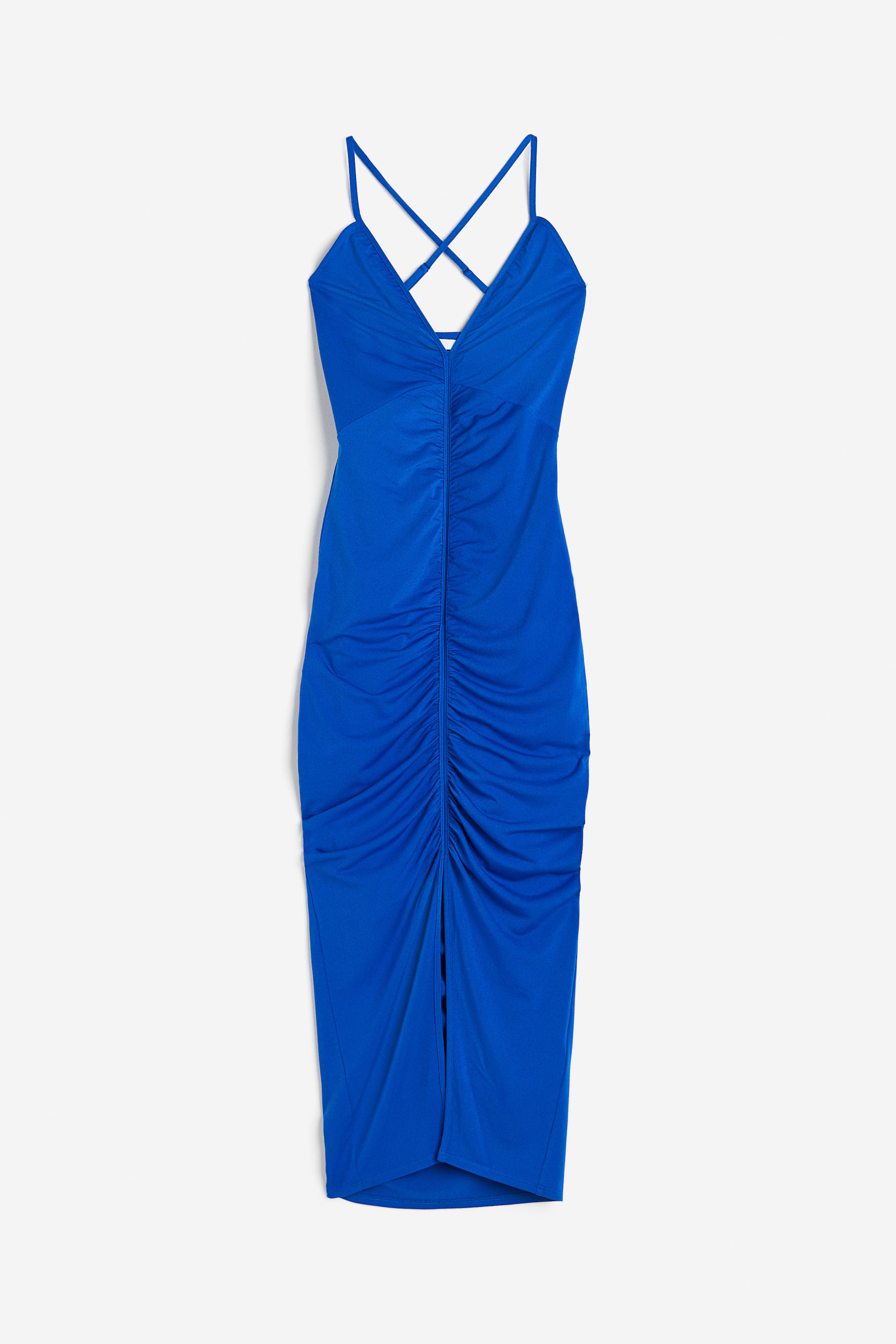 Calf-length, fitted dress in jersey crêpe with a deep V-neckline and narrow, adjustable shoulder straps that cross at the back. Gathers down the front that create a draped effect. Slit at the front of the hem.