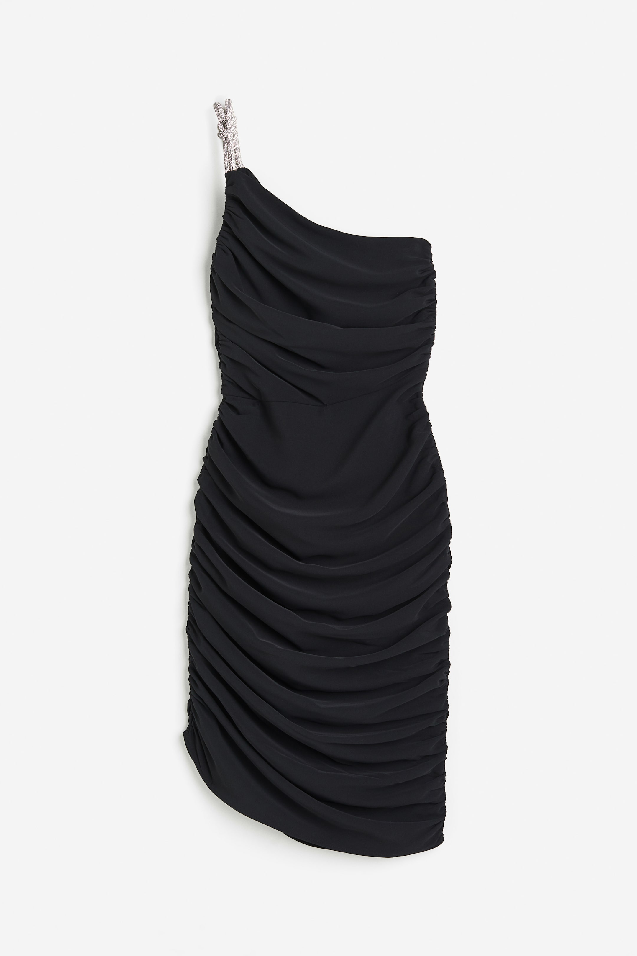 Short, fitted, one-shoulder dress in woven fabric. One rhinestone-embellished shoulder strap with a decorative knot at the front, a concealed zip at one side and gathered side seams that create a draped effect. Asymmetric hem. Jersey lining.