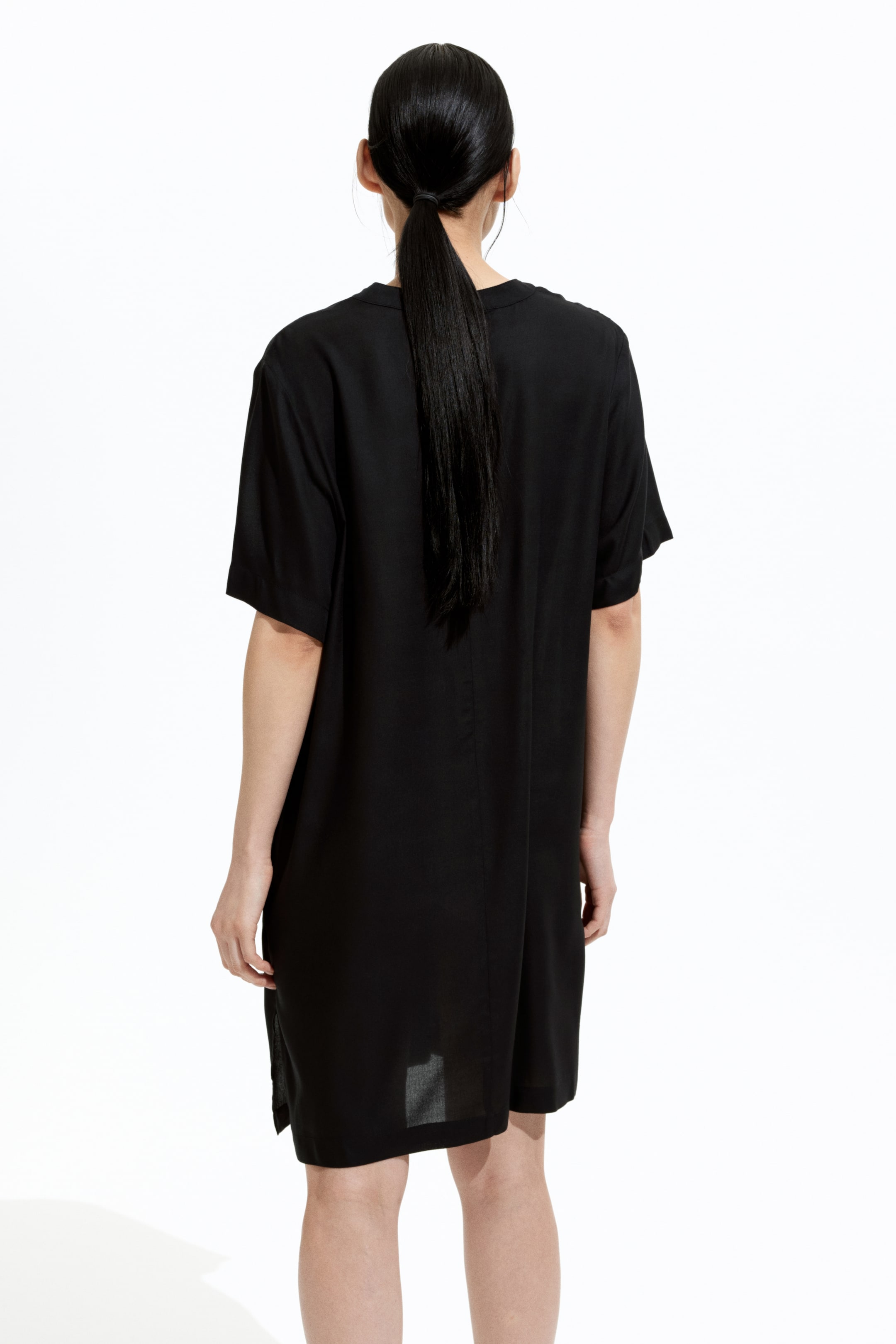 Knee-length tunic dress in an airy viscose weave with a band collar and a V-shaped opening at the front. Loose fit with gently dropped shoulders, short sleeves and a straight-cut hem with a slit at each side. Slightly longer at the back. Unlined.