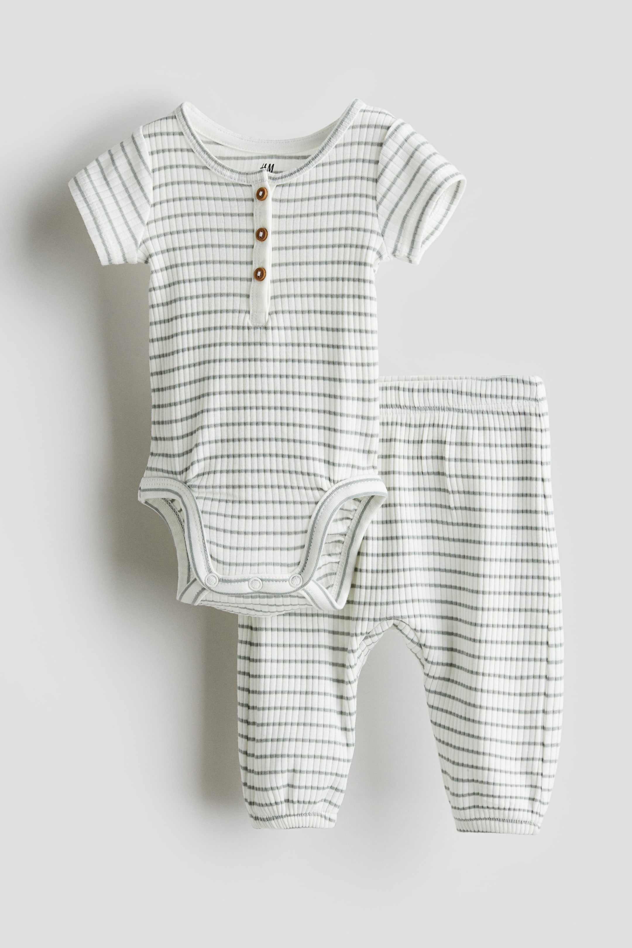 Set with a bodysuit and pair of leggings in supersoft cotton jersey. Short-sleeved bodysuit with a round neckline, press-studs at the crotch for easy changing and gathered seams around the legs for a more comfortable and snug fit around the nappy. Leggings with soft, covered elastication at the waist for a comfortable fit over the tummy.