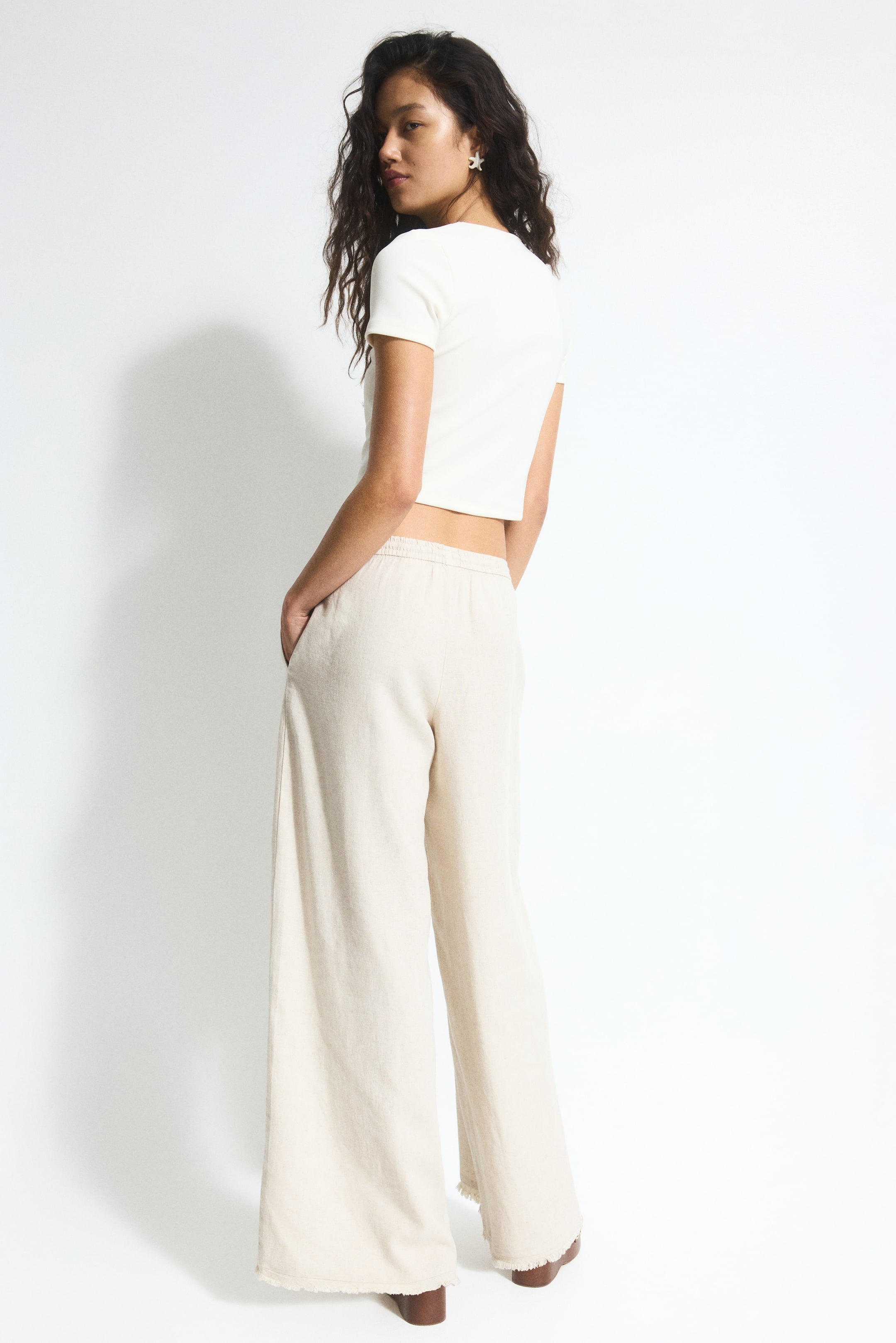 Loose-fit trousers in an airy weave made from a linen and viscose blend. Elasticated smocking and a cord drawstring at the waist. Discreet side pockets, wide legs and raw-edge hems.
