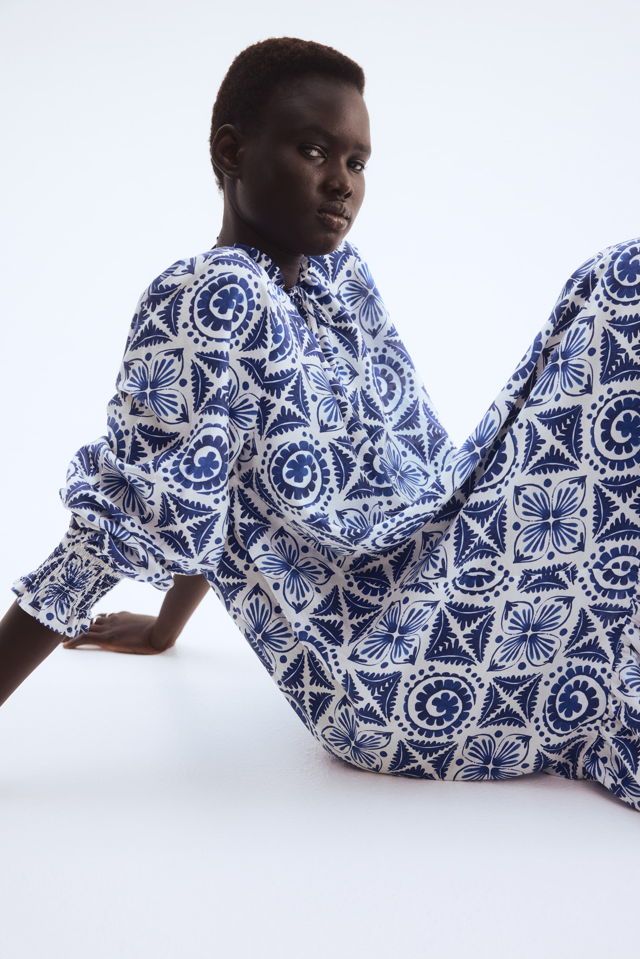 Loose-fit dress in woven fabric with a frilled stand collar and a V-shaped opening with spaghetti ties at the top. Long, raglan balloon sleeves with smocking and a frill trim at the cuffs. Gathered seam above the knees for added volume. Unlined.