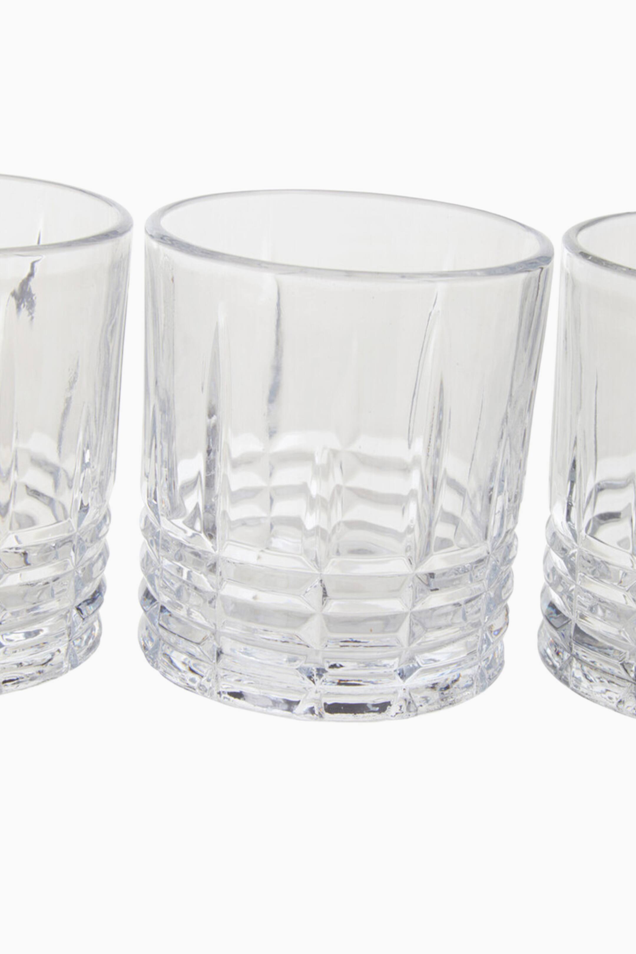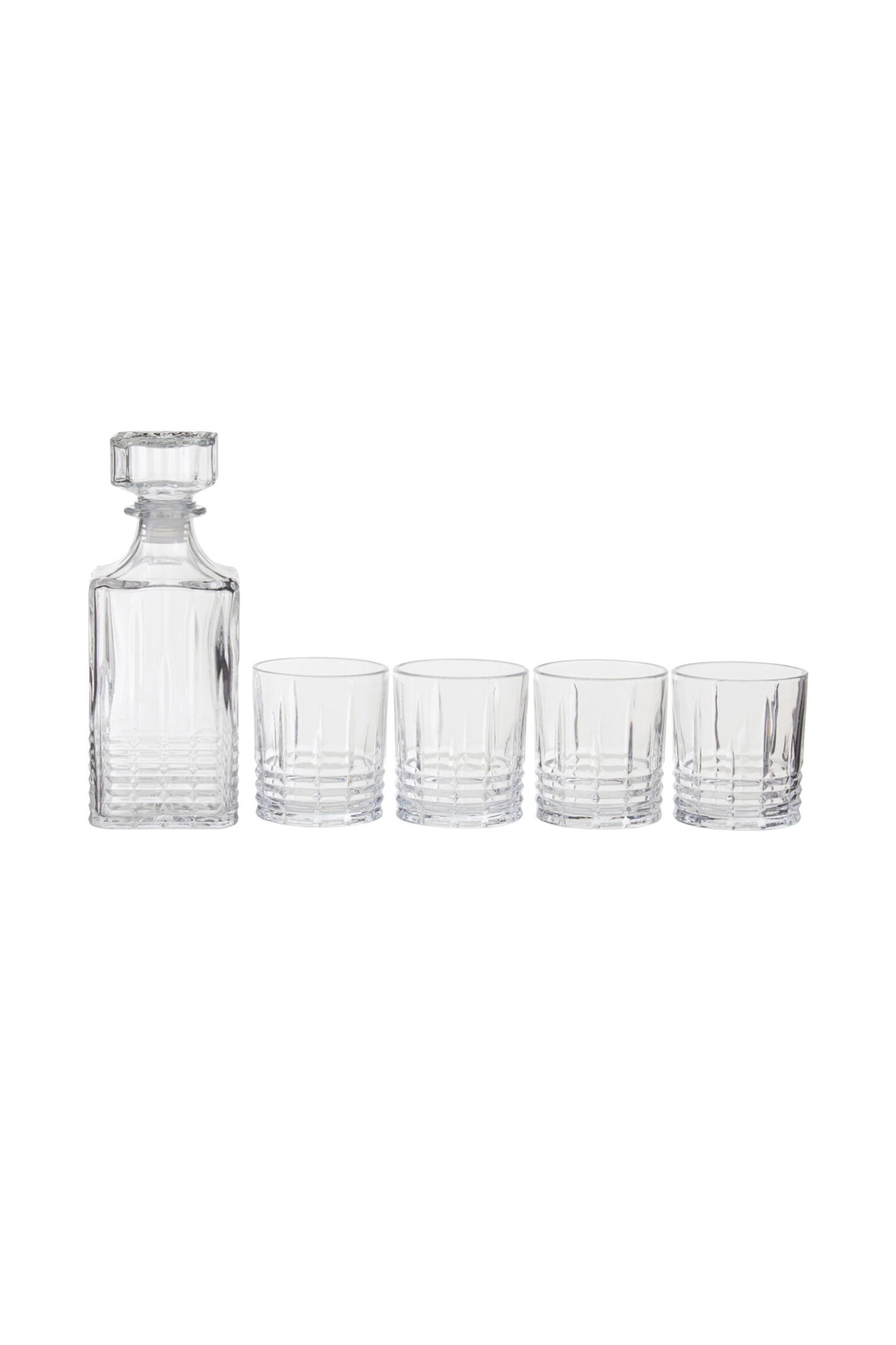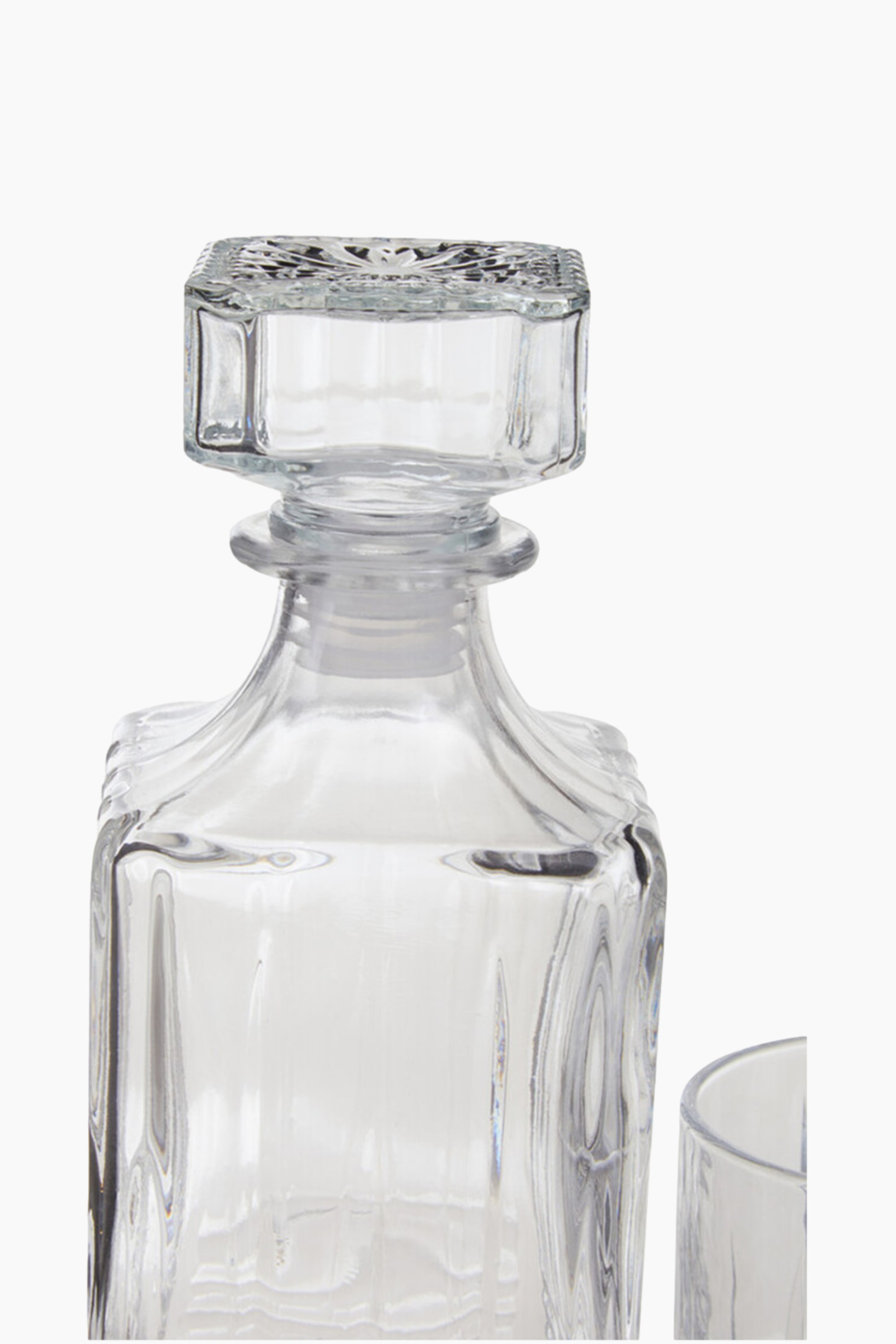 Crafted by artisan craftsmen, this clear glass decanter comes with four matching glasses with an artful ribbed detail. Featuring a timeless design, the decanter with an airtight lid will bring a touch of luxury when filled with liquor. Dishwasher safe. Dimensions - Width 24 cm x Depth 27 cm x Height 10 cm
