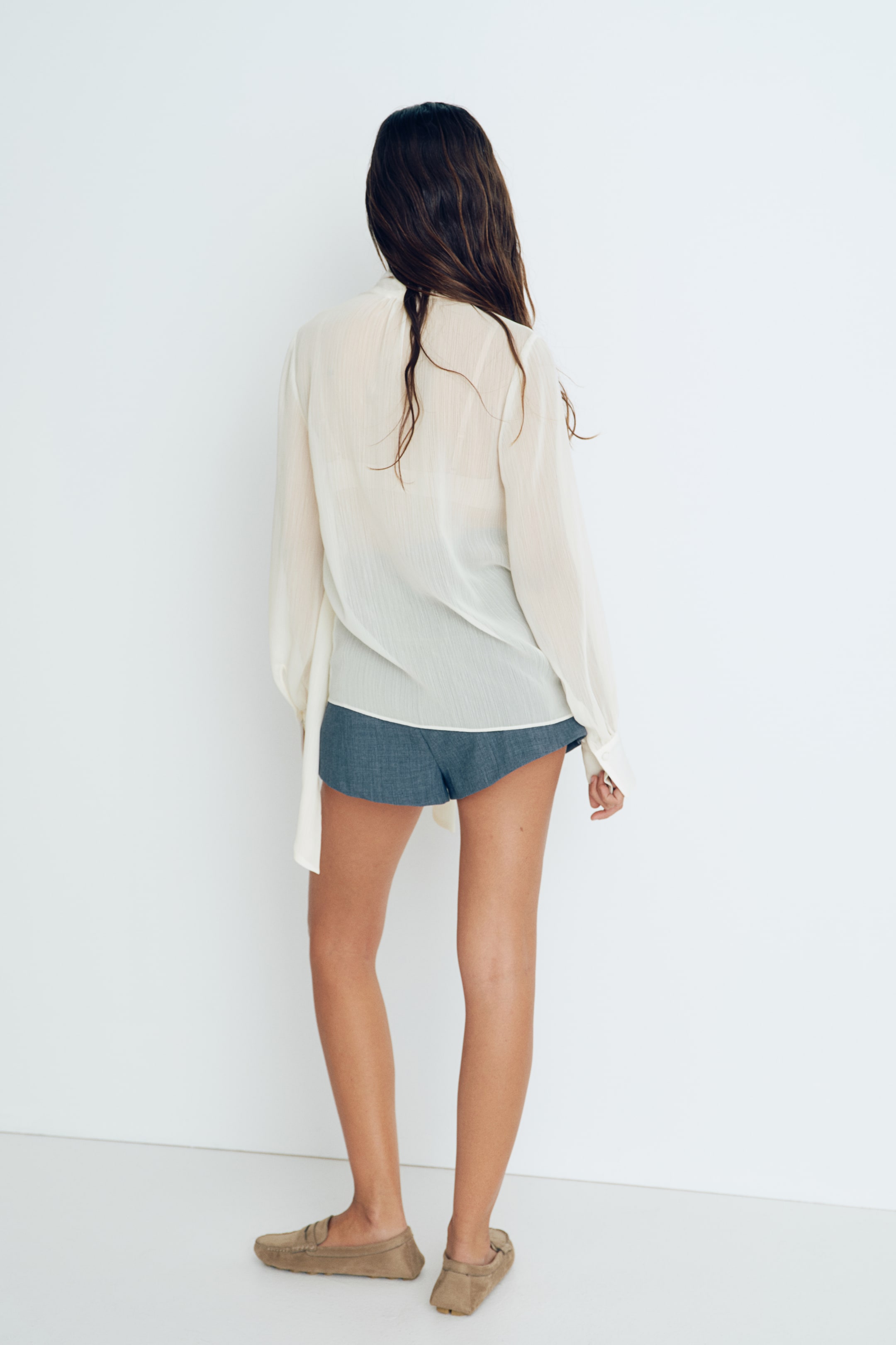 Blouse in sheer chiffon with a bow collar and a V-shaped opening at the front. Gathers on the shoulders and long balloon sleeves with buttoned cuffs. Unlined.