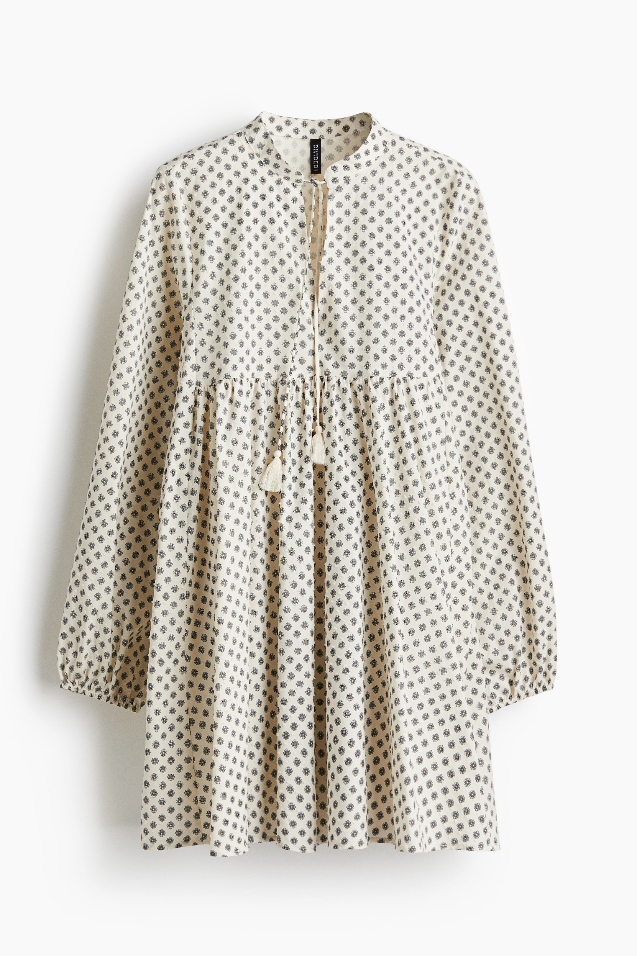 Short, slightly A-line dress in an airy cotton weave featuring a band collar with a V-shaped opening and narrow ties with a tassel at the ends. Loose fit with long balloon sleeves that have narrow elastication at the cuffs. Gathered seam at the front and back of the waist. Unlined.