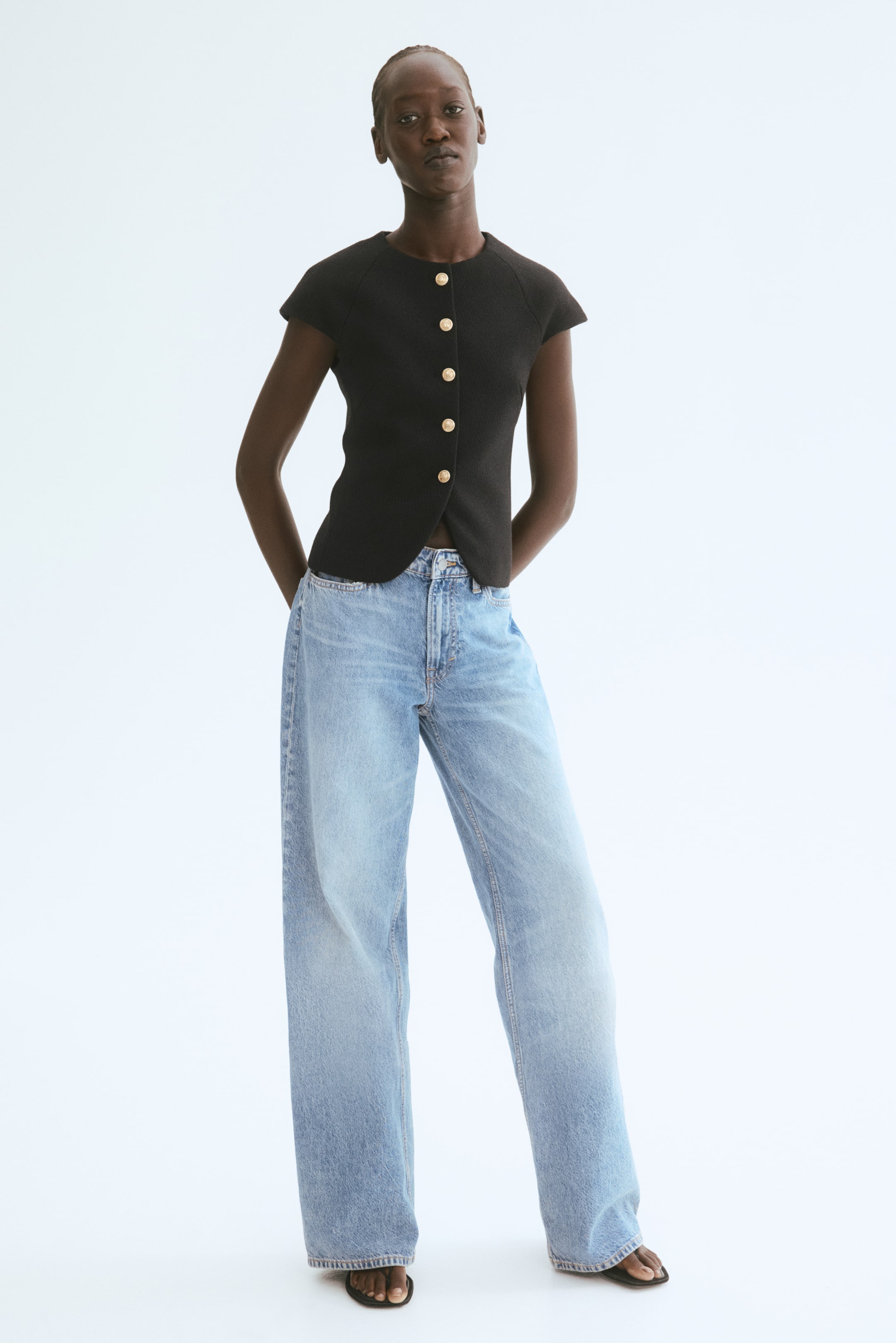 Short, fitted top in woven fabric with a round neckline and buttons down the front. Cap sleeves in a raglan cut, bust darts and shaping seams at the front and back. Lined.