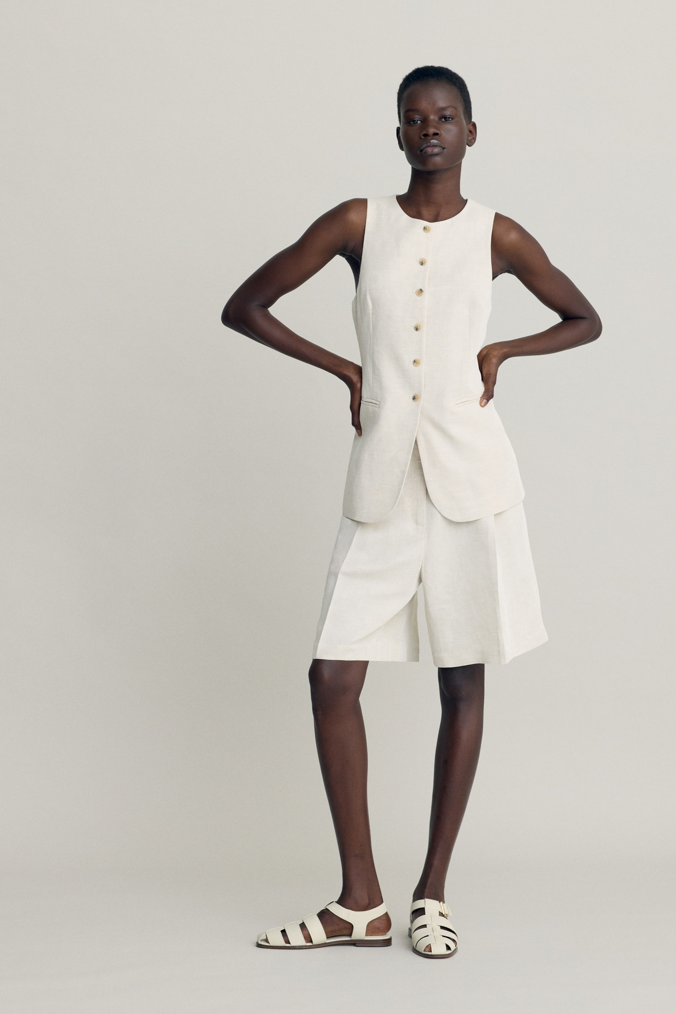 Knee-length shorts in a linen and viscose weave with a high waist and a zip fly with a concealed button and hook-and-bar fastener. Diagonal side pockets, welt back pockets, pleats at the front and creases down the front and back.