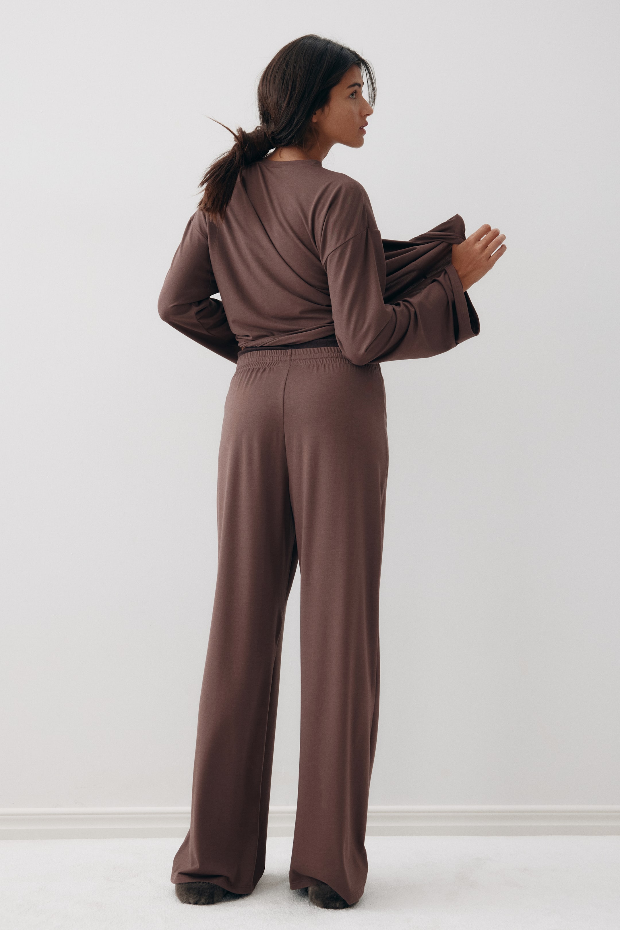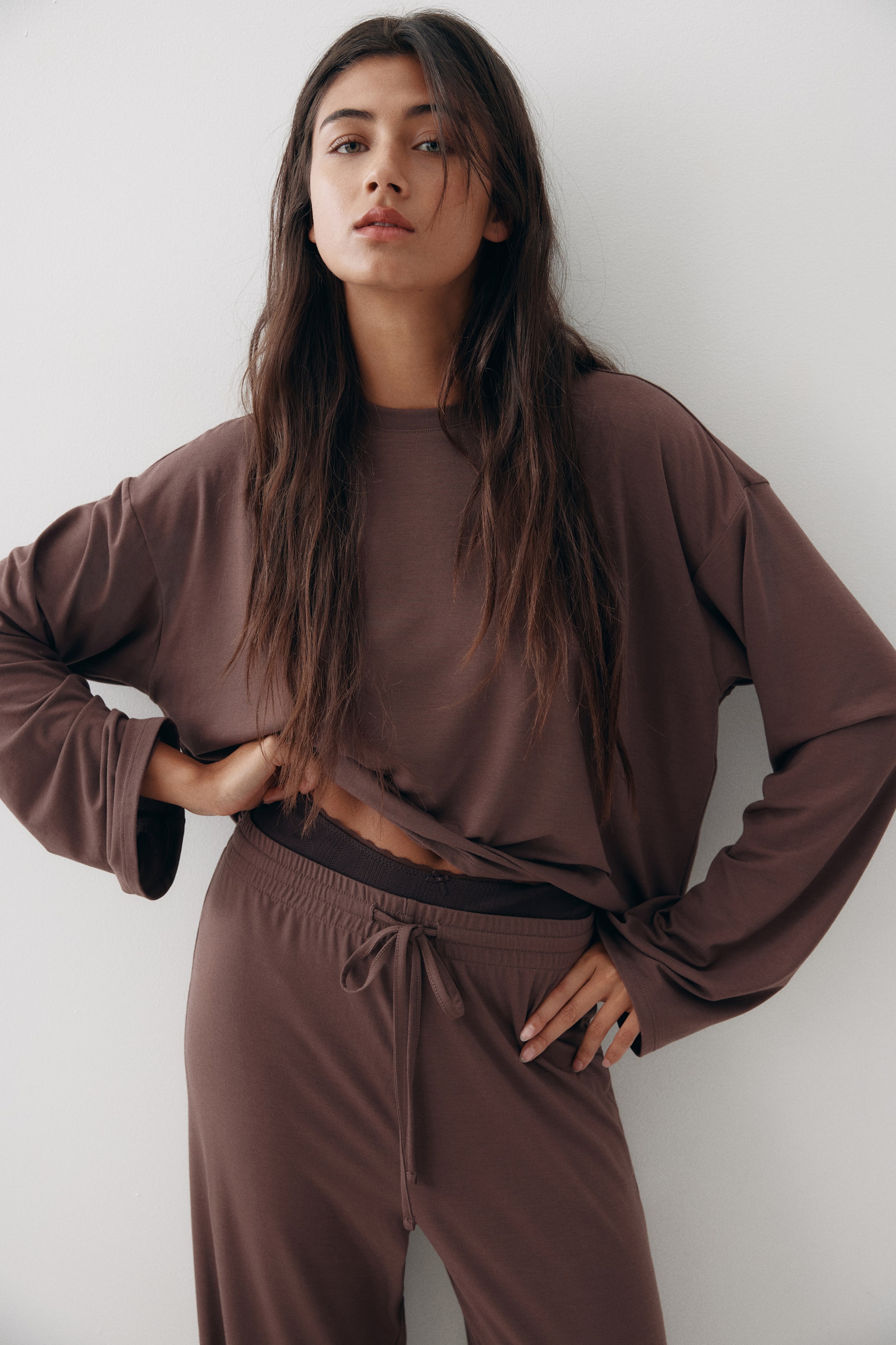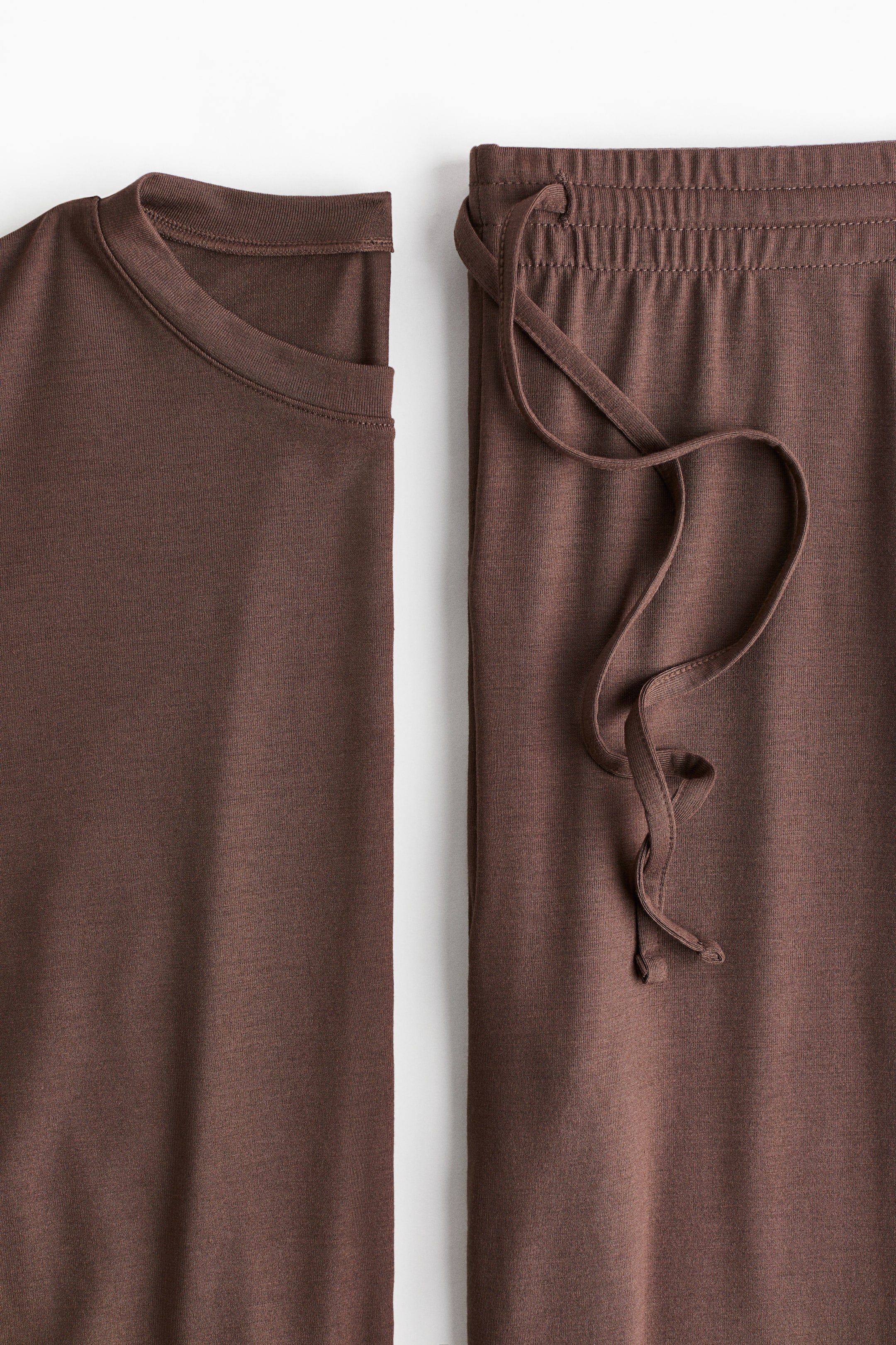 Pyjamas with a top and pair of bottoms in soft, viscose-blend jersey. Top with a round neckline, dropped shoulders and long sleeves. Bottoms with covered elastication and a drawstring at the waist and straight legs.