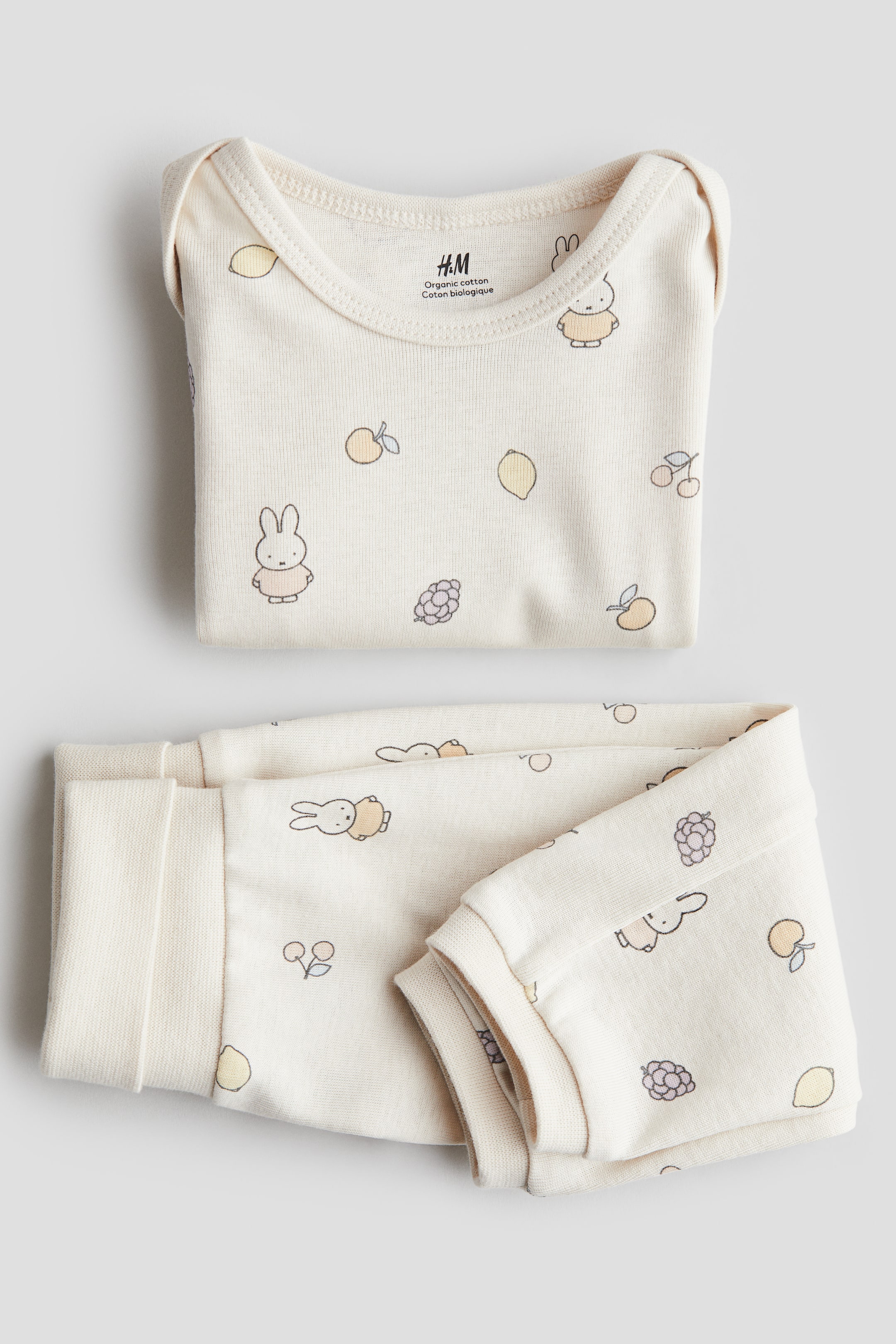 Set with a bodysuit and pair of trousers in soft cotton jersey with an all-over print. Bodysuit with an envelope neck for smooth dressing and press-studs at the bottom for easy changing. Gathered seams around the legs for a more comfortable and snug fit around the nappy. Trousers with a foldover waist for a comfortable fit around the tummy and narrow, ribbed hems.