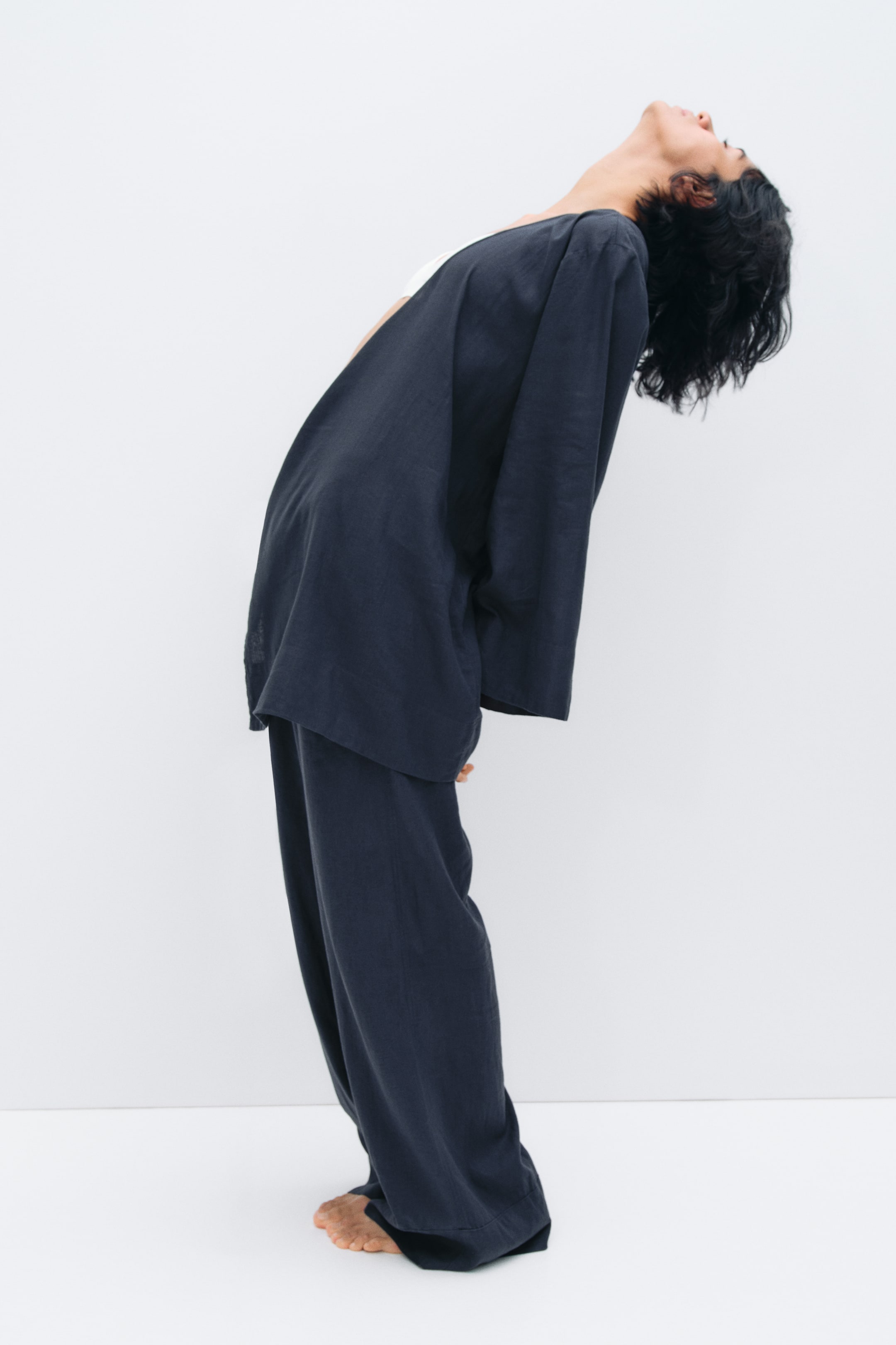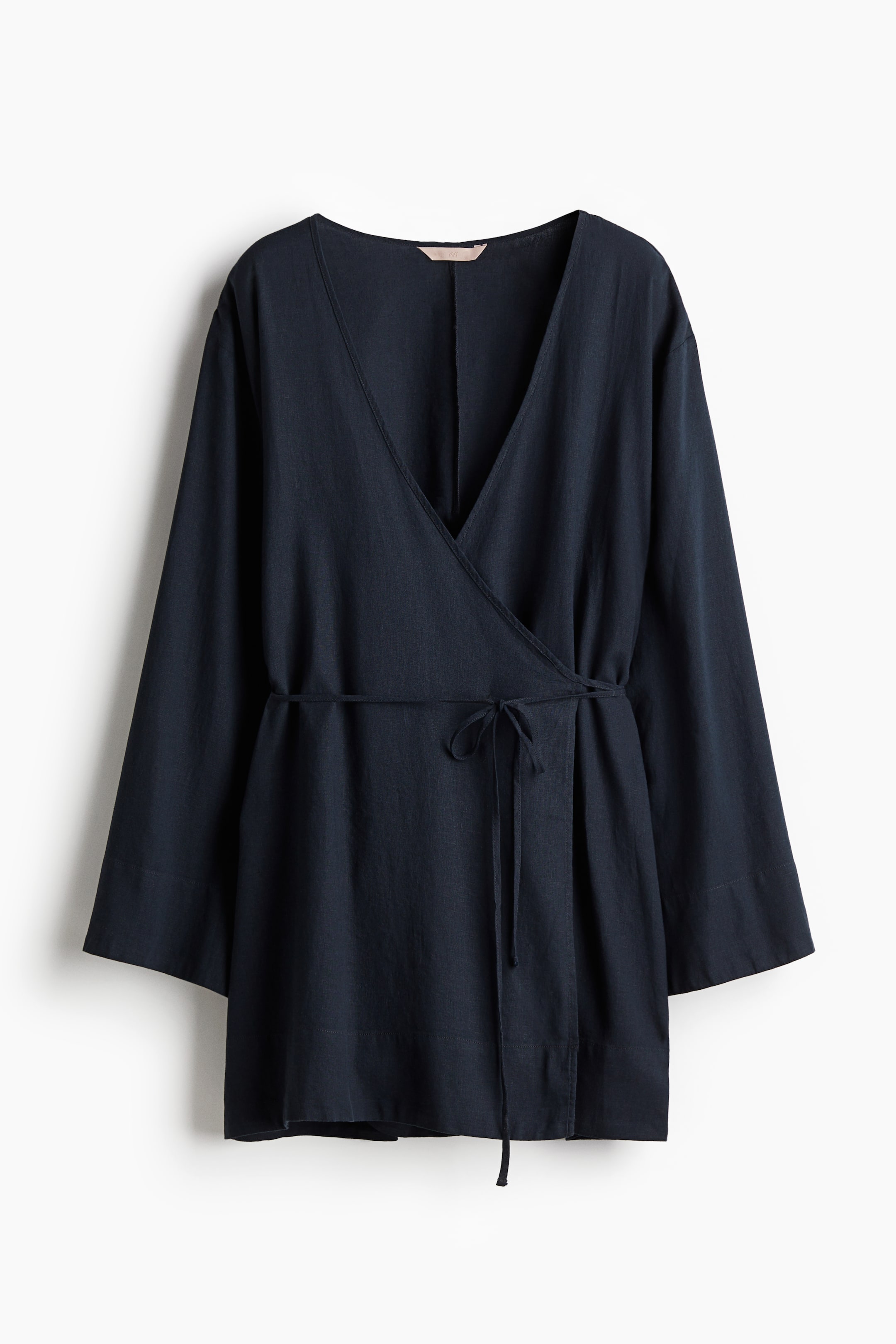 Short dressing gown in an airy weave made from a linen and viscose blend. V-neckline, a wrapover front with narrow ties, dropped shoulders and long sleeves.