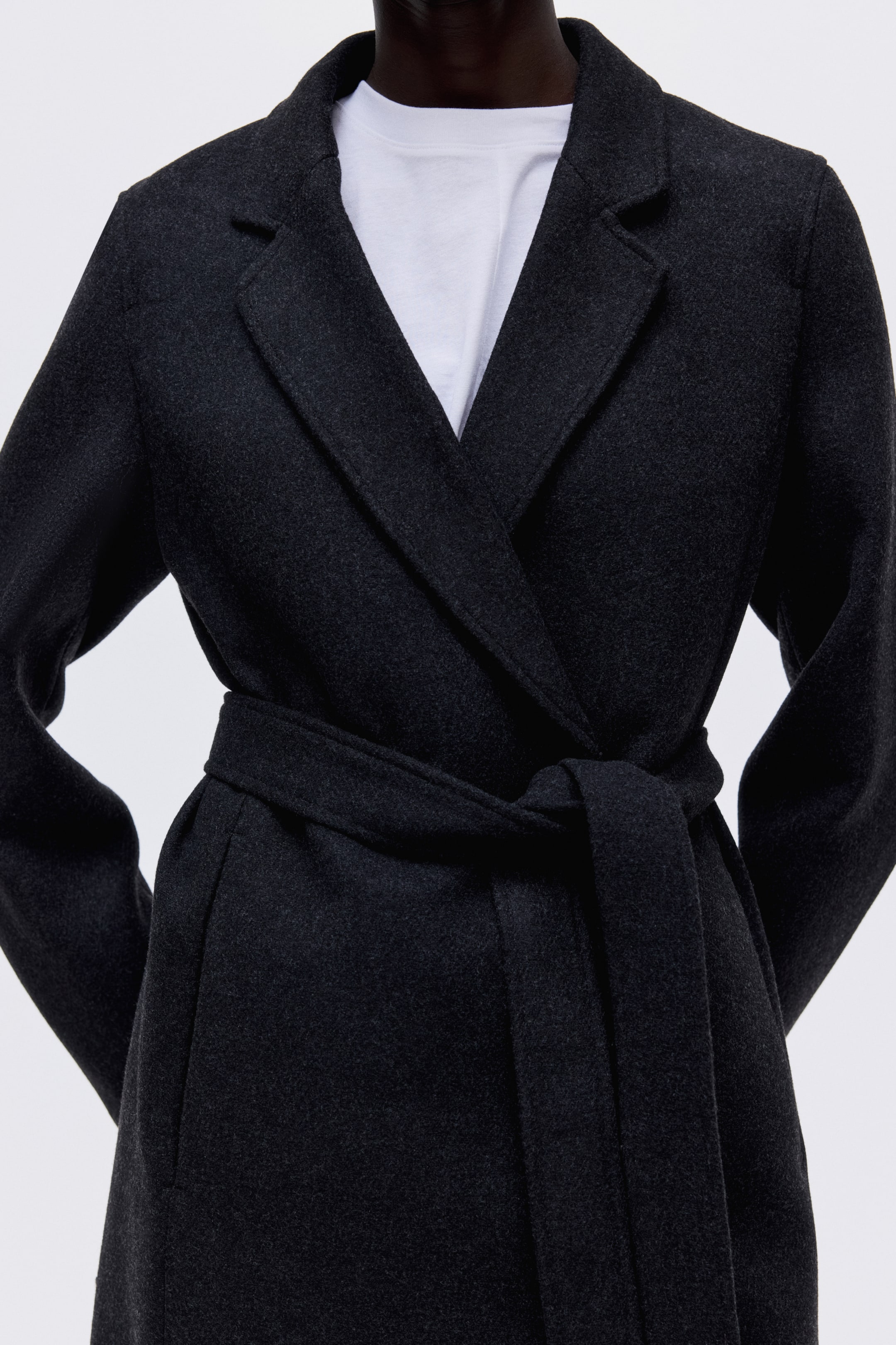 Knee-length, fitted coat in woven fabric with notch lapels and concealed press-studs at the front. Discreet side pockets, a tie belt at the waist and a single back vent. Lined.