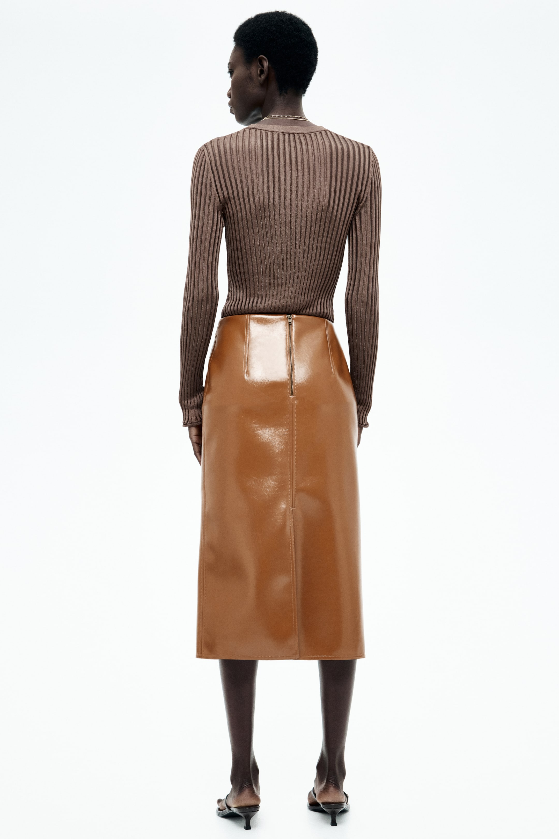 Calf-length, fitted skirt in coated fabric featuring a high waist with shaping darts at the front and back and a zip with a concealed button at the back. Straight-cut hem with a slit at the back. Unlined.