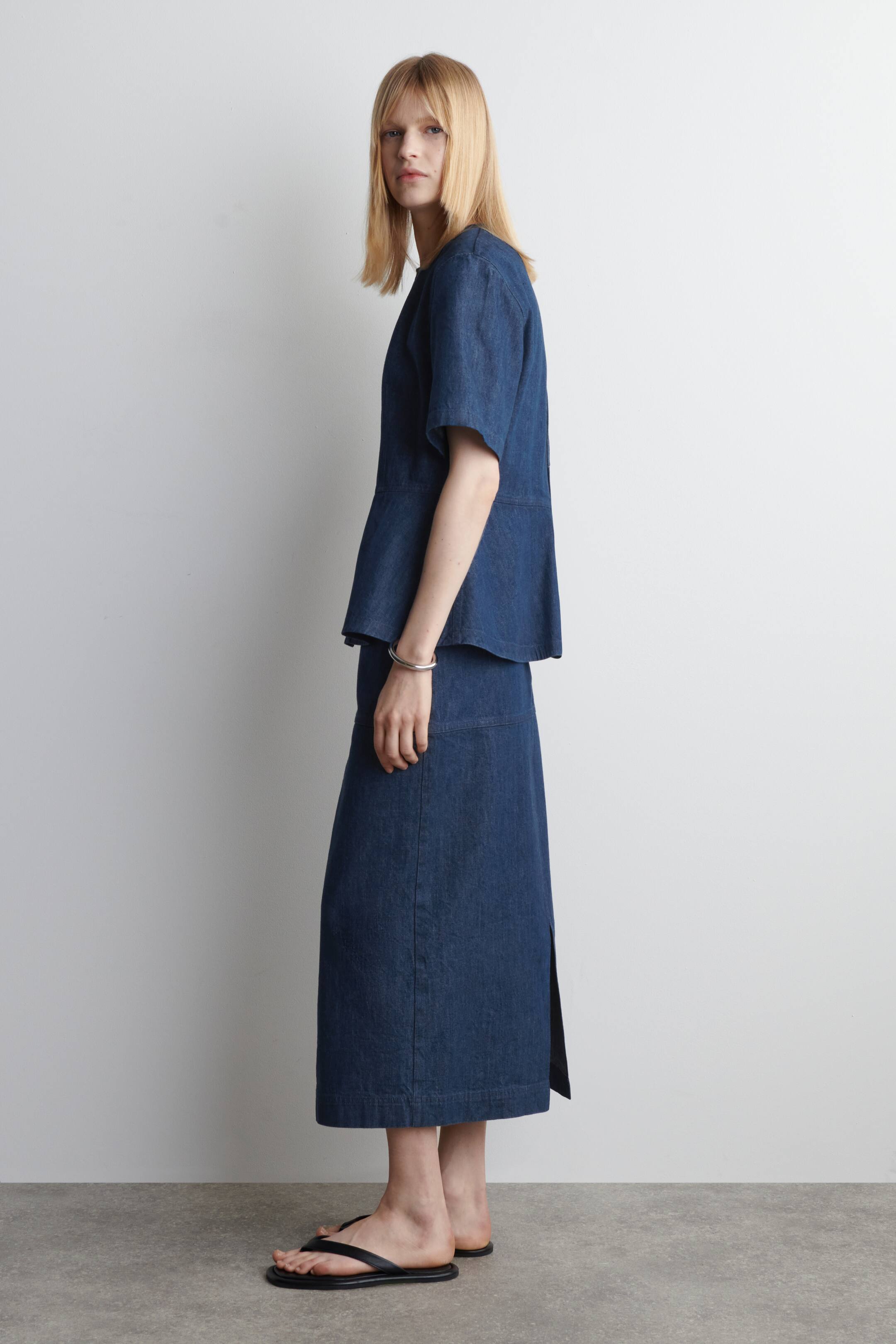 The classic peplum top is reimagined for Spring Summer 2025. This modern piece is made from dark-blue denim and designed with contourting waist darts and a keyhole cutout at the back that closes with tonal ties. Style it with the matching skirt. Regular fit Tie closure Organic cotton is cotton grown without the use of artificial pesticides or fertilisers and contains no genetically modified organisms Shell: 80% Organic cotton, 20% Recycled cotton. Excluding trims / Machine wash Back length of size EU 36 is 63cm / Model wears a size EU 36