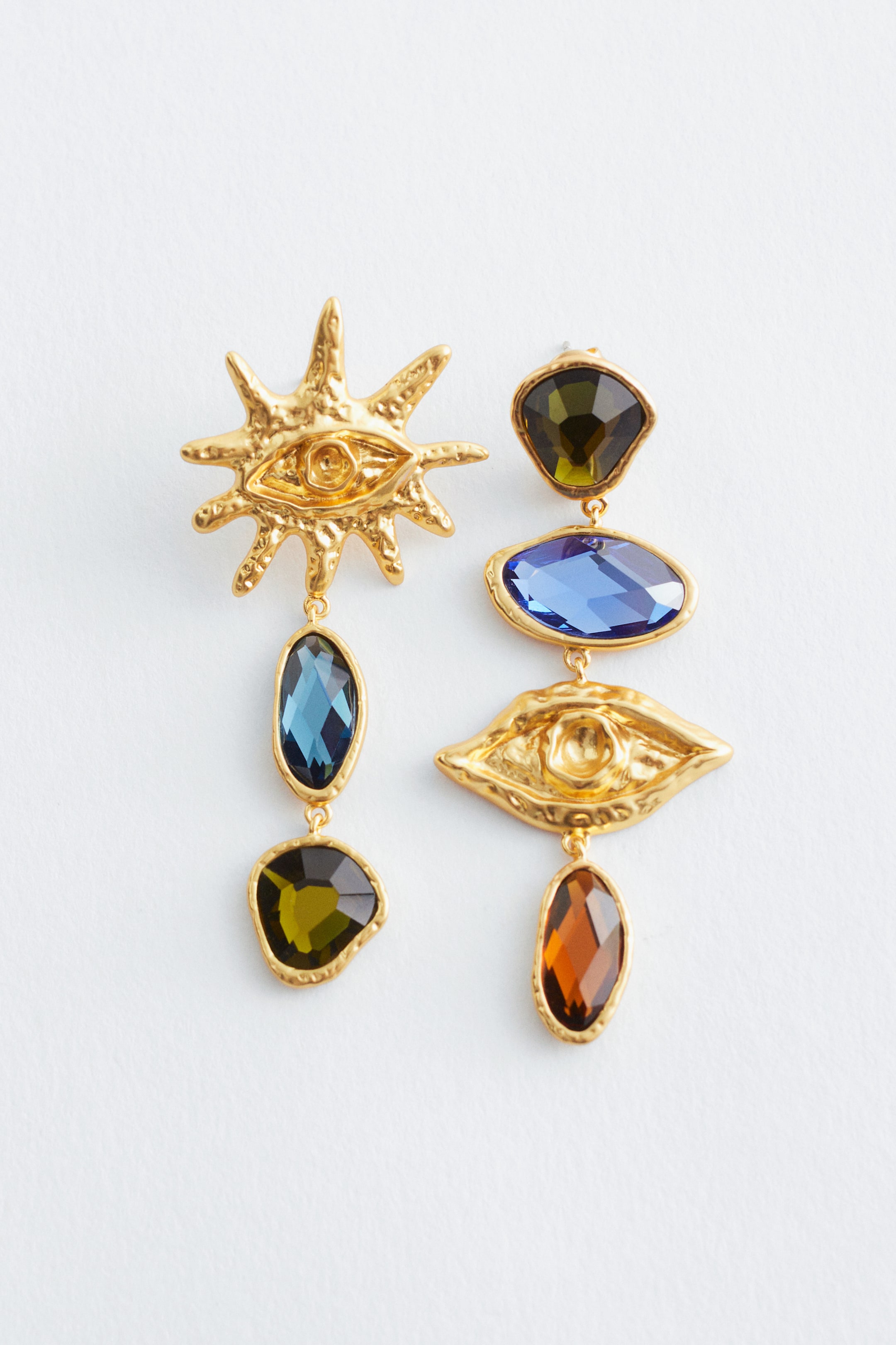 These statement earrings consist of individual decorations arranged into long, mismatched strands. Some elements are figurative, while others are faceted glass crystals in various colours. Nickel tested Butterfly backings Total lengths: 5.2cm and 5.8cm / 2” and 2.3”